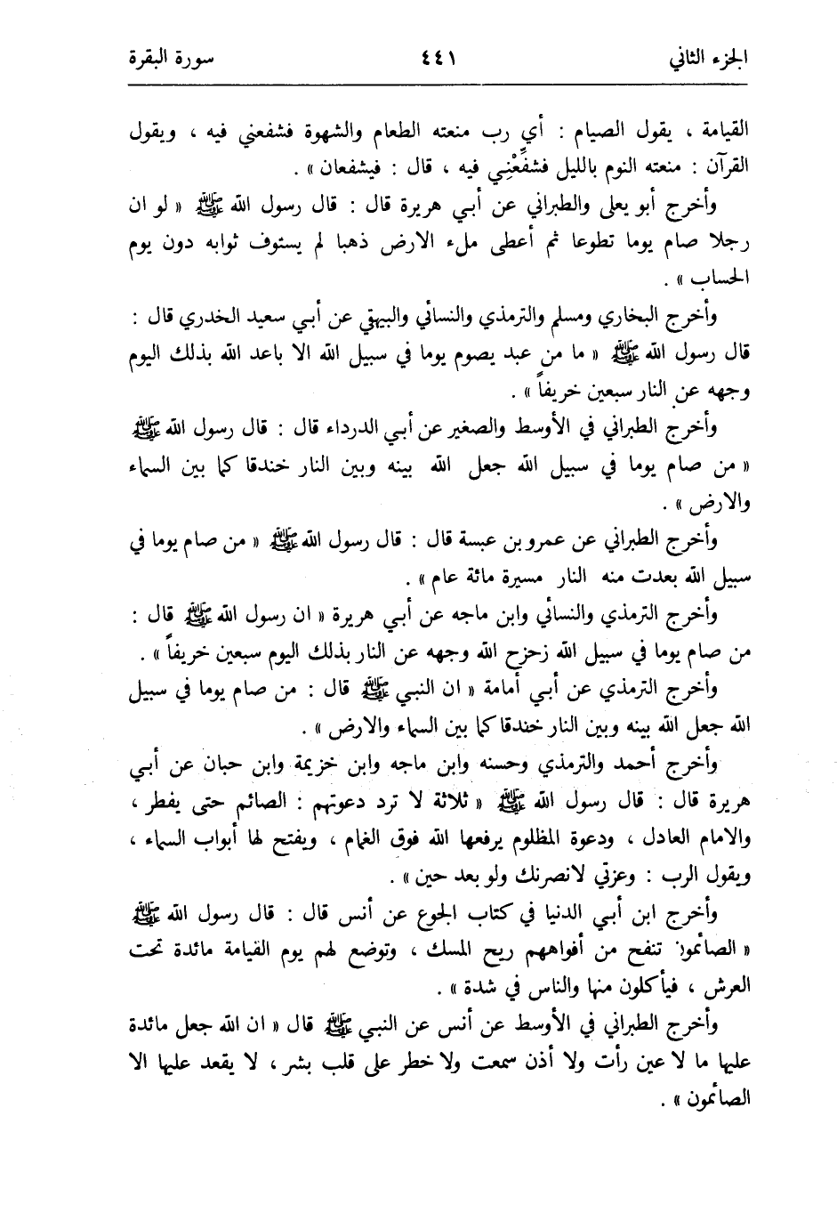 وَأخرج البُخَارِيّ وَمُسلم وَالتِّرْمِذِيّ وَالنَّسَائِيّ وَالْبَيْهَقِيّ عَن أبي سعيد الْخُدْرِيّ قَالَ: قَالَ رَسُول الله صلى الله عَلَيْهِ وَسلم مَا من عبد يَصُوم يَوْمًا فِي سَبِيل الله إِلَّا باعد الله بذلك الْيَوْم وَجهه عَن النَّار سبعين خَرِيفًا