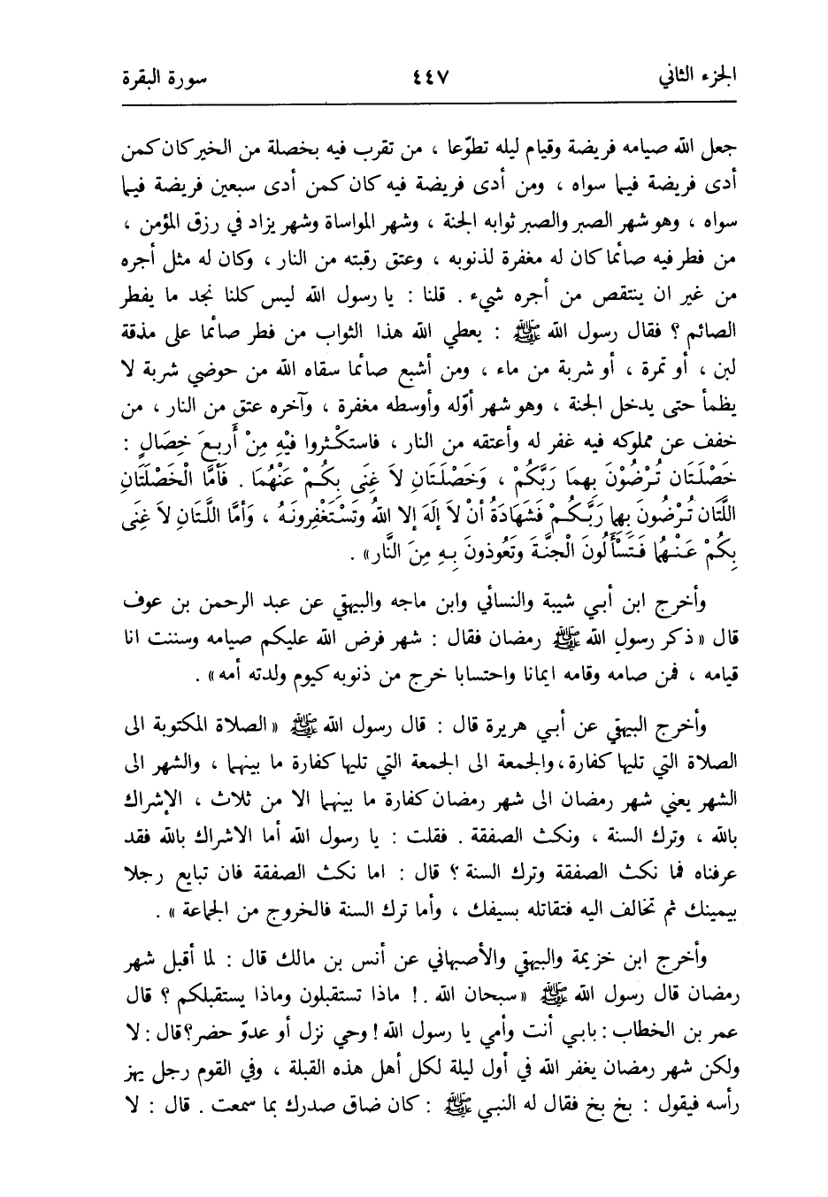 وَأخرج ابْن خُزَيْمَة وَالْبَيْهَقِيّ والأصبهاني عَن أنس بن مَالك قَالَ: لما أقبل شهر رَمَضَان قَالَ رَسُول الله صلى الله عَلَيْهِ وَسلم سُبْحَانَ الله مَاذَا تستقبلون وماذا يستقبلكم قَالَ عمر بن الْخطاب: بِأبي أَنْت وَأمي يَا رَسُول الله وَحي نزل أَو عدوّ حضر قَالَ: لَا وَلَكِن شهر رَمَضَان يغْفر الله فِي أول لية لكل أهل هَذِه الْقبْلَة وَفِي الْقَوْم رجل يهز رَأسه فَيَقُول: بخ بخ فَقَالَ لَهُ النَّبِي صلى الله عَلَيْهِ وَسلم: كَأَن ضَاقَ صدرك بِمَا سَمِعت