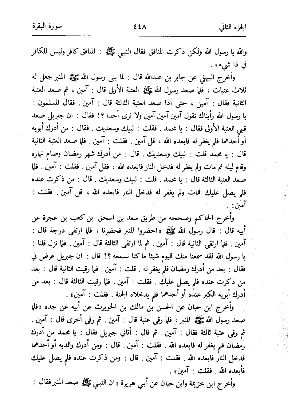 فَقَالَ الْمُسلمُونَ: يَا رَسُول الله رَأَيْنَاك تَقول آمين آمين آمين وَلَا نرى أحدا فَقَالَ: إِن جِبْرِيل صعد قبلي العتبة الأولى فَقَالَ: يَا مُحَمَّد