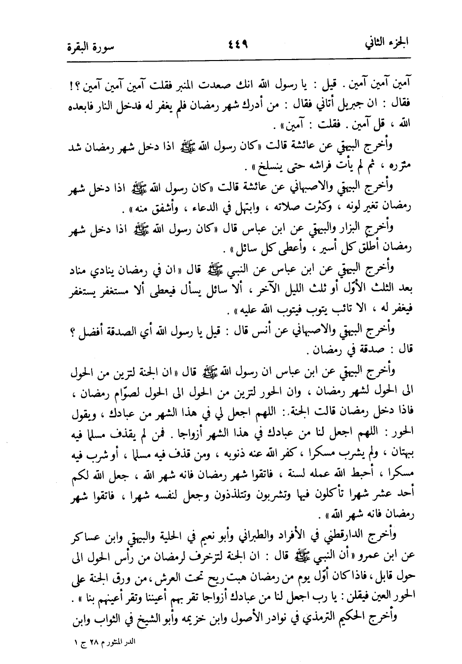 وَأخرج الدَّارَقُطْنِيّ فِي الْأَفْرَاد وَالطَّبَرَانِيّ وَأَبُو نعيم فِي الْحِلْية وَالْبَيْهَقِيّ وَابْن عَسَاكِر عَن ابْن عَمْرو أَن النَّبِي صلى الله عَلَيْهِ وَسلم قَالَ: إِن الْجنَّة لتزخرف لرمضان من رَأس الْحول إِلَى حول قَابل فَإِذا كَانَ أوّل يَوْم من رَمَضَان هبت ريح تَحت الْعَرْش من ورق الْجنَّة على الْحور الْعين فيقلن: يَا رب اجْعَل لنا من عِبَادك أَزْوَاجًا تقر بهم أَعيننَا وتقر أَعينهم بِنَا