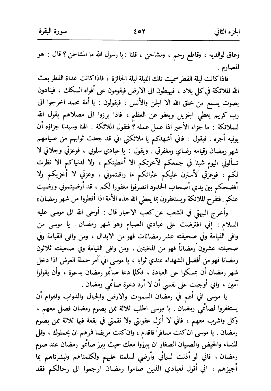 يَا مُوسَى إِن كنت مُسْفِرًا فاقدم وَإِن كنت مَرِيضا فمرهم أَن يحملوك وَقل للنِّسَاء وَالْحيض وَالصبيان الصغار أَن يبرزوا مَعَك حَيْثُ يبرز صائمو رَمَضَان عِنْد صَوْم رَمَضَان فَإِنِّي لَو أَذِنت لسمائي وأرضي لسلمتا عَلَيْهِم ولكلمتاهم ولبشرتاهم بِمَا أجيزهم إِنِّي أَقُول لعبادي الَّذين صَامُوا رَمَضَان ارْجعُوا إِلَى رحالكُمْ فقد