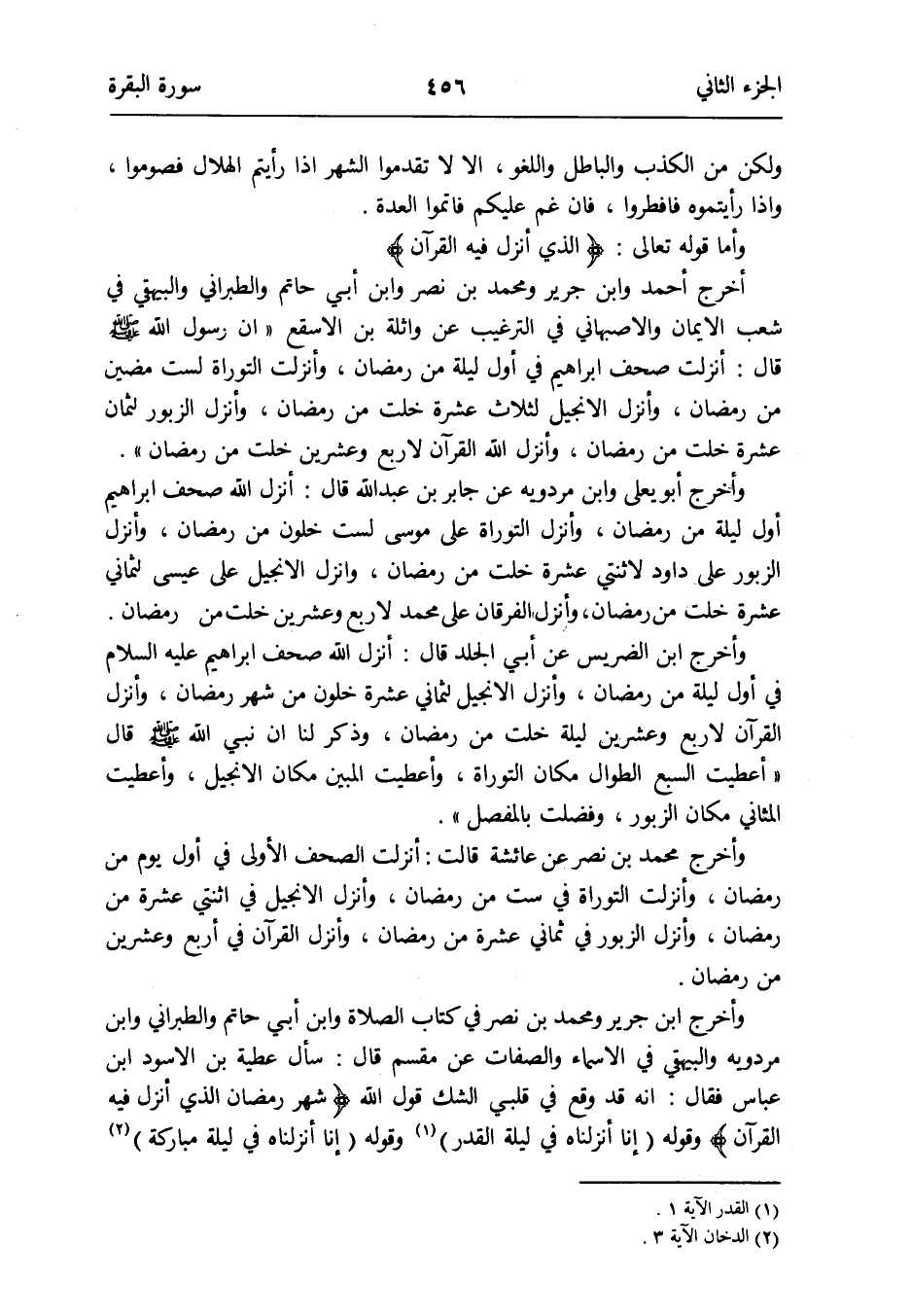 وَأخرج أَبُو يعلى وَابْن مرْدَوَيْه عَن جَابر بن عبد الله قَالَ: أنزل الله صحف إِبْرَاهِيم أول لَيْلَة من رَمَضَان وَأنزل التَّوْرَاة على مُوسَى لست خلون من رَمَضَان وَأنزل الزبُور على دَاوُد لِاثْنَتَيْ عشرَة خلت من رَمَضَان وَأنزل الانجيل على عِيسَى لثماني عشرَة خلت من رَمَضَان وَأنزل الْفرْقَان على مُحَمَّد لأَرْبَع وَعشْرين خلت من رَمَضَان