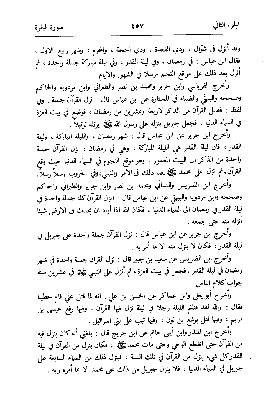 وَأخرج ابْن جرير عَن ابْن عَبَّاس قَالَ: شهر رَمَضَان وَاللَّيْلَة الْمُبَارَكَة وَلَيْلَة الْقدر فَإِن لَيْلَة الْقدر هِيَ اللَّيْلَة الْمُبَارَكَة وَهِي فِي رَمَضَان نزل الْقُرْآن جملَة من الذّكر إِلَى الْبَيْت الْمَعْمُور وَهُوَ موقع النُّجُوم فِي السَّمَاء الدُّنْيَا حَيْثُ وَقع الْقُرْآن ثمَّ نزل على مُحَمَّد صلى الله عَلَيْهِ وَسلم بعد ذَلِك فِي الْأَمر وَالنَّهْي وَفِي الحروب رسلًا رسلًا