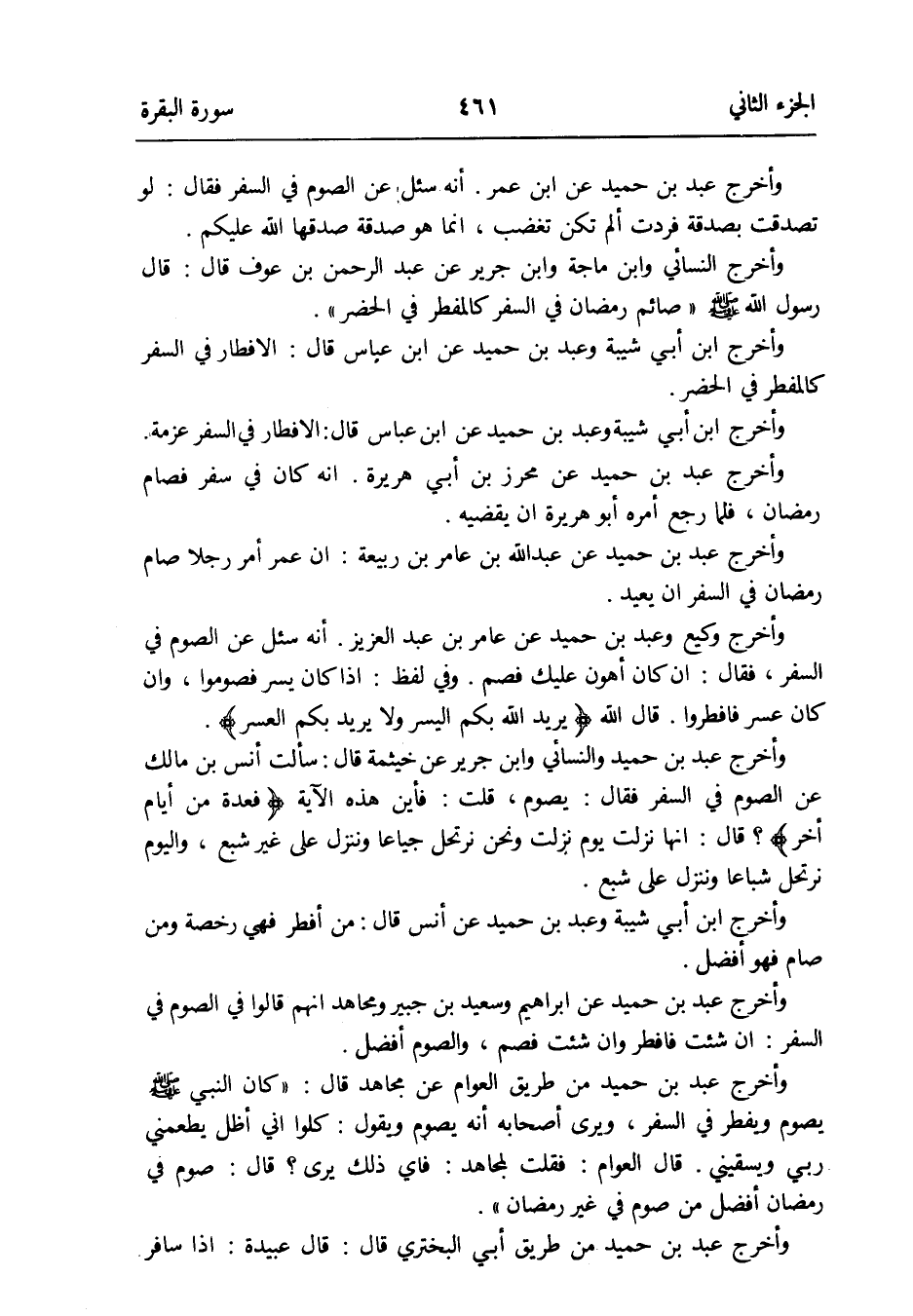 وَأخرج النَّسَائِيّ وَابْن ماجة وَابْن جرير عَن عبد الرَّحْمَن بن عَوْف قَالَ: قَالَ رَسُول الله صلى الله عَلَيْهِ وَسلم صَائِم رَمَضَان فِي السّفر كالمفطر فِي الْحَضَر