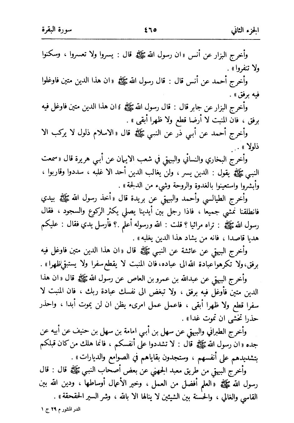 وَأخرج البُخَارِيّ وَالنَّسَائِيّ وَالْبَيْهَقِيّ فِي شعب الإِيمان عَن أبي هُرَيْرَة قَالَ سَمِعت النَّبِي صلى الله عَلَيْهِ وَسلم يَقُول: الدّين يسر وَلنْ يغالب الدّين أحد إِلَّا غَلبه سددوا وقاربوا وَأَبْشِرُوا وَاسْتَعِينُوا بالغدوة والروحة وَشَيْء من الدلجة