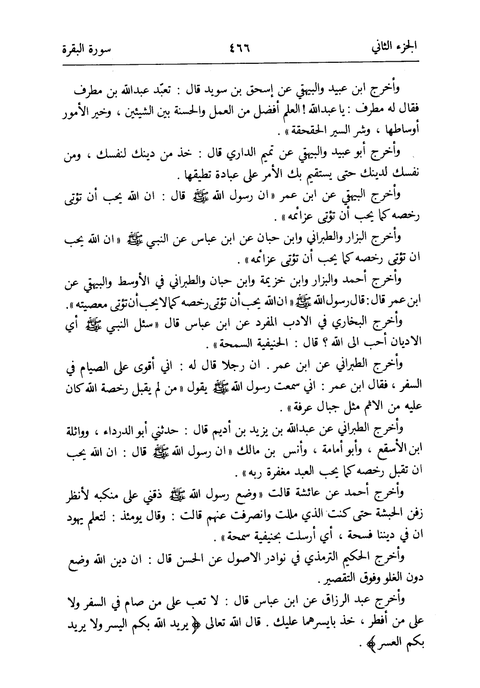 وَأخرج الْبَيْهَقِيّ عَن ابْن عمر أَن رَسُول الله صلى الله عَلَيْهِ وَسلم قَالَ: إِن الله يحب أَن يُؤْتى رخصه كَمَا يحب أَن تُؤْتى عَزَائِمه