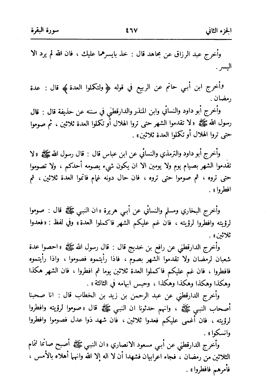 وَأخرج أَبُو دَاوُد وَالتِّرْمِذِيّ وَالنَّسَائِيّ عَن ابْن عَبَّاس قَالَ: قَالَ رَسُول الله صلى الله عَلَيْهِ وَسلم لَا تقدمُوا الشَّهْر بصيام يَوْم وَلَا يَوْمَيْنِ إِلَّا أَن يكون شَيْء يَصُومهُ أحدكُم وَلَا تَصُومُوا حَتَّى تروه ثمَّ صُومُوا حَتَّى تروه فَإِن حَال دونه الْغَمَام فَأتمُّوا الْعدة ثَلَاثِينَ ثمَّ افطروا
