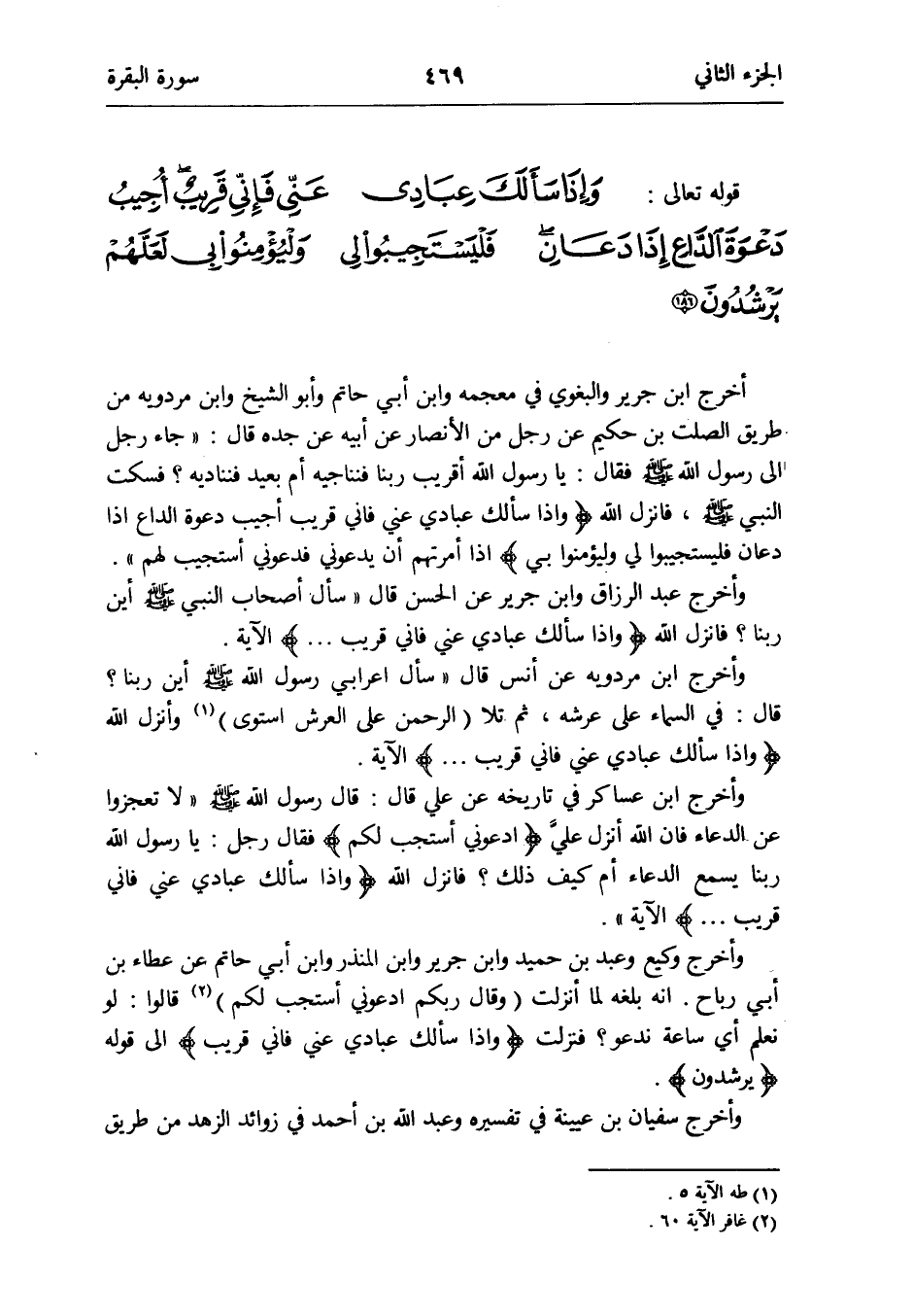 أَنه بلغه لما أنزلت (وَقَالَ ربكُم ادْعُونِي أستجيب لكم) (غَافِر الْآيَة 60) قَالُوا: لَو نعلم أَي سَاعَة نَدْعُو فَنزلت {وَإِذا سَأَلَك عبَادي عني فَإِنِّي قريب} إِلَى قَوْله {يرشدون}