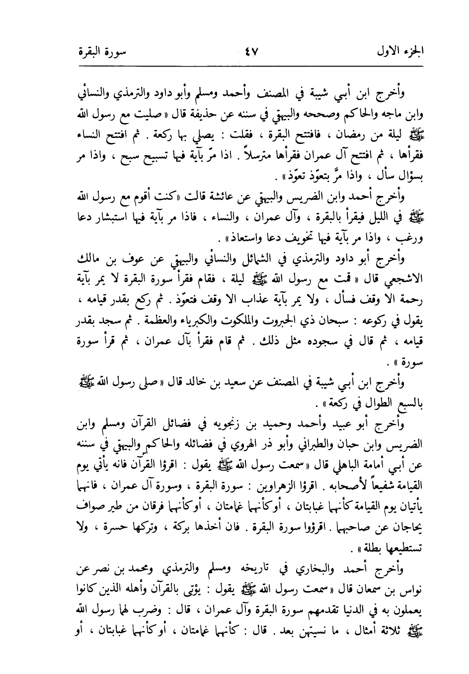 وَأخرج أَبُو عبيد وَأحمد وَحميد بن زَنْجوَيْه فِي فَضَائِل الْقُرْآن وَمُسلم وَابْن الضريس وَابْن حبَان وَالطَّبَرَانِيّ وَأَبُو ذَر الْهَرَوِيّ فِي فضائله وَالْحَاكِم وَالْبَيْهَقِيّ فِي سنَنه عَن أبي أُمَامَة الْبَاهِلِيّ قَالَ سَمِعت رَسُول الله صلى الله عَلَيْهِ وَسلم يَقُول: اقرؤا الْقُرْآن فانه يَأْتِي يَوْم الْقِيَامَة شَفِيعًا لأَصْحَابه