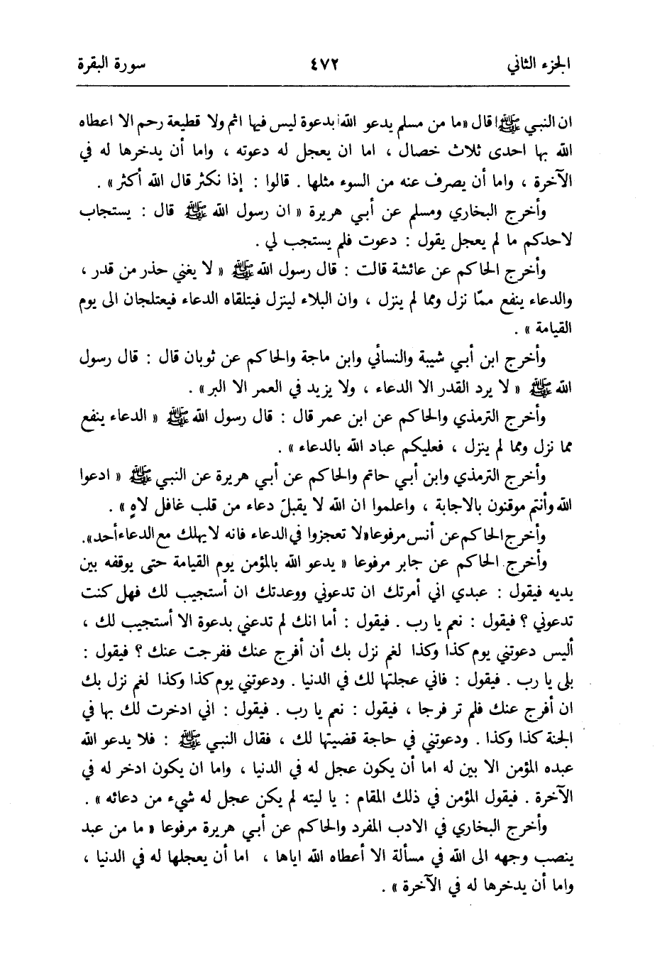 أَن النَّبِي صلى الله عَلَيْهِ وَسلم قَالَ مَا من مُسلم يَدْعُو الله بدعوة لَيْسَ فِيهَا اثم وَلَا قطيعة رحم إِلَّا أعطَاهُ الله بهَا إِحْدَى ثَلَاث خِصَال إِمَّا أَن يعجل لَهُ دَعوته وَإِمَّا أَن يدخرها لَهُ فِي الْآخِرَة وَإِمَّا أَن يصرف عَنهُ من السوء مثلهَا