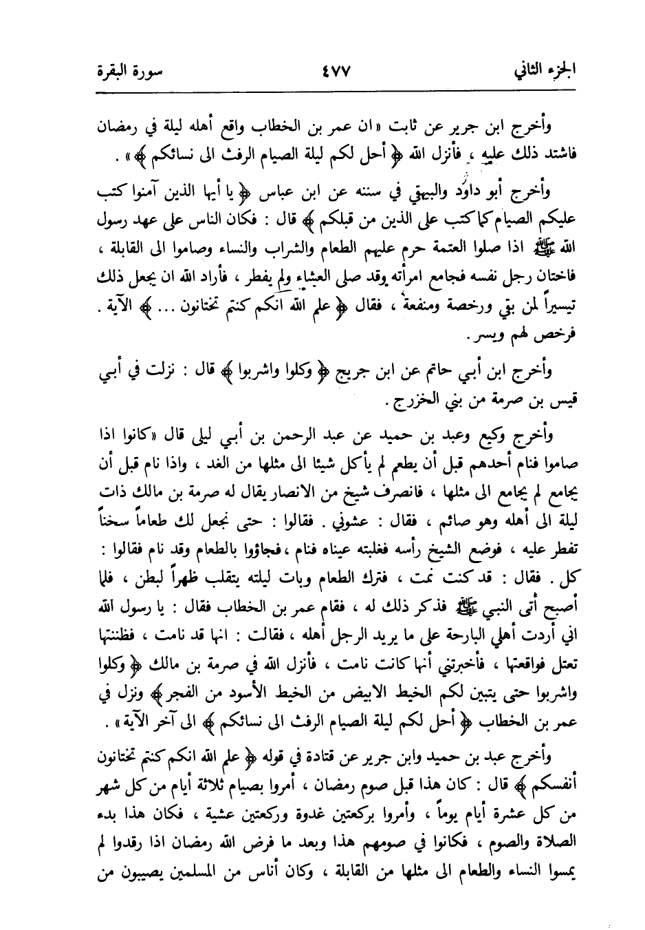 وَأخرج ابْن جرير عَن ثَابت أَن عمر بن الْخطاب وَاقع أَهله لَيْلَة فِي رَمَضَان فَاشْتَدَّ عَلَيْهِ ذَلِك فَأنْزل الله {أحل لكم لَيْلَة الصّيام الرَّفَث إِلَى نِسَائِكُم}