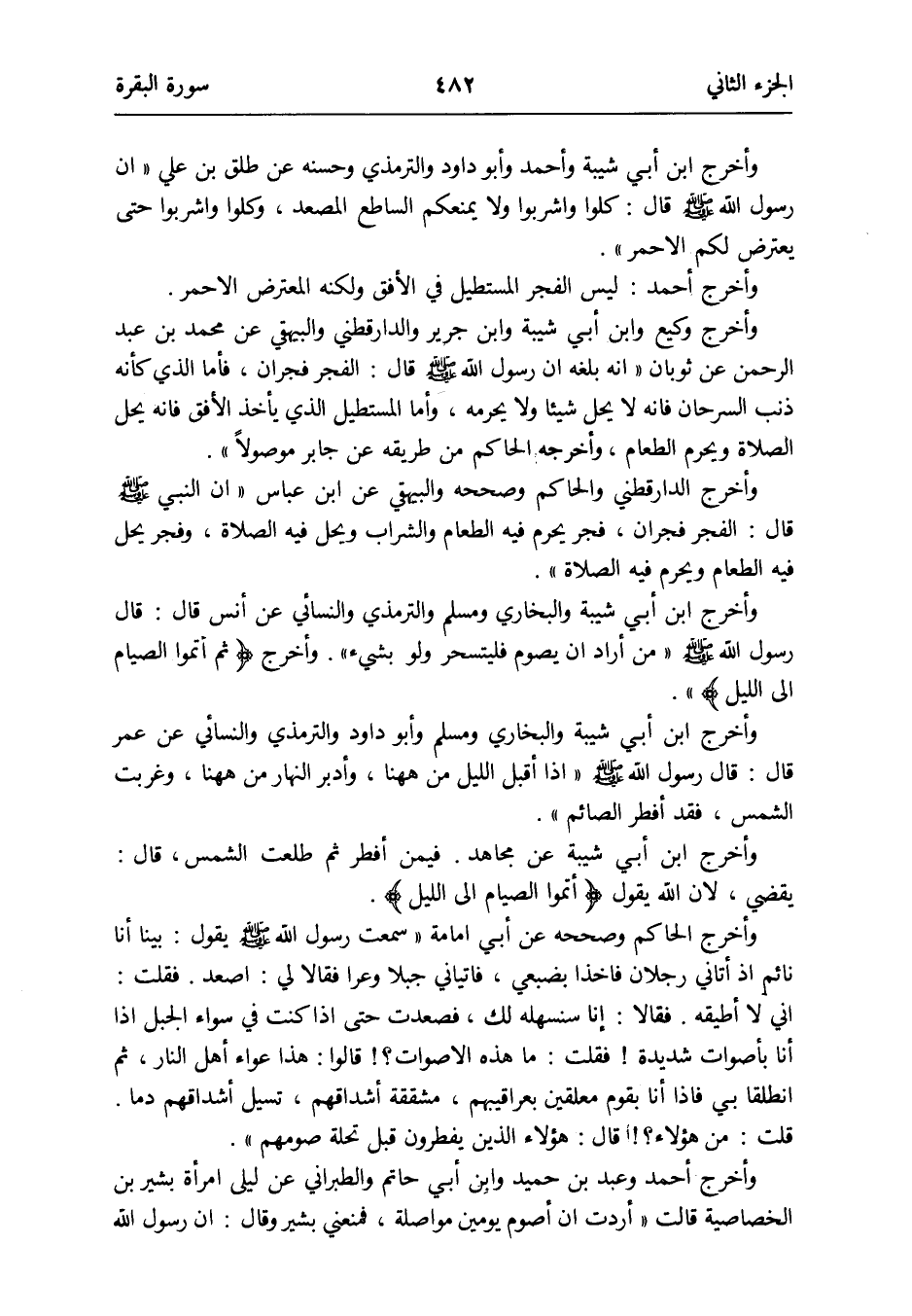 وَأخرج ابْن أبي شيبَة وَأحمد وَأَبُو دَاوُد وَالتِّرْمِذِيّ وَحسنه عَن طلق بن عَليّ أَن رَسُول الله صلى الله عَلَيْهِ وَسلم قَالَ: كلوا وَاشْرَبُوا وَلَا يمنعكم الساطع المصعد وكلوا وَاشْرَبُوا حَتَّى يعْتَرض لكم الْأَحْمَر