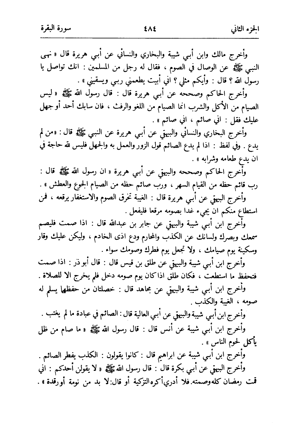 وَأخرج الْحَاكِم وَصَححهُ عَن أبي هُرَيْرَة قَالَ: قَالَ رَسُول الله صلى الله عَلَيْهِ وَسلم لَيْسَ الصّيام من الْأكل وَالشرب إِنَّمَا الصّيام من اللَّغْو والرفث فَإِن سابك أحد أَو جهل عَلَيْك فَقل: إِنِّي صَائِم إِنِّي صَائِم