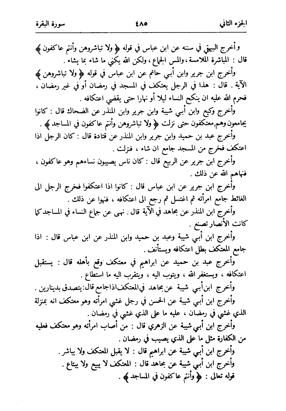وَأخرج ابْن جرير عَن ابْن عَبَّاس قَالَ: كَانُوا إِذا اعتكفوا فَخرج الرجل إِلَى الْغَائِط جَامع امْرَأَته ثمَّ اغْتسل ثمَّ رَجَعَ إِلَى اعْتِكَافه فنهوا عَن ذَلِك