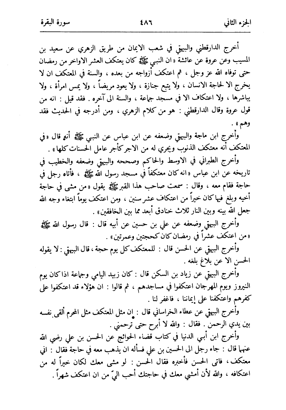 وَأخرج الدَّارَقُطْنِيّ وَالْبَيْهَقِيّ فِي شعب الإِيمان من طَرِيق الزُّهْرِيّ عَن سعيد بن الْمسيب وَعَن عُرْوَة عَن عَائِشَة أَن النَّبِي صلى الله عَلَيْهِ وَسلم كَانَ يعْتَكف الْعشْر الْأَوَاخِر من رَمَضَان حَتَّى توفاه الله عز وَجل ثمَّ اعْتكف أَزوَاجه من بعده وَالسّنة فِي الْمُعْتَكف أَن لَا يخرج إِلَّا لحَاجَة الإِنسان وَلَا يتبع جَنَازَة وَلَا يعود مَرِيضا وَلَا يمس امْرَأَة وَلَا يُبَاشِرهَا وَلَا اعْتِكَاف إِلَّا فِي مَسْجِد جمَاعَة وَالسّنة إِلَى آخِره