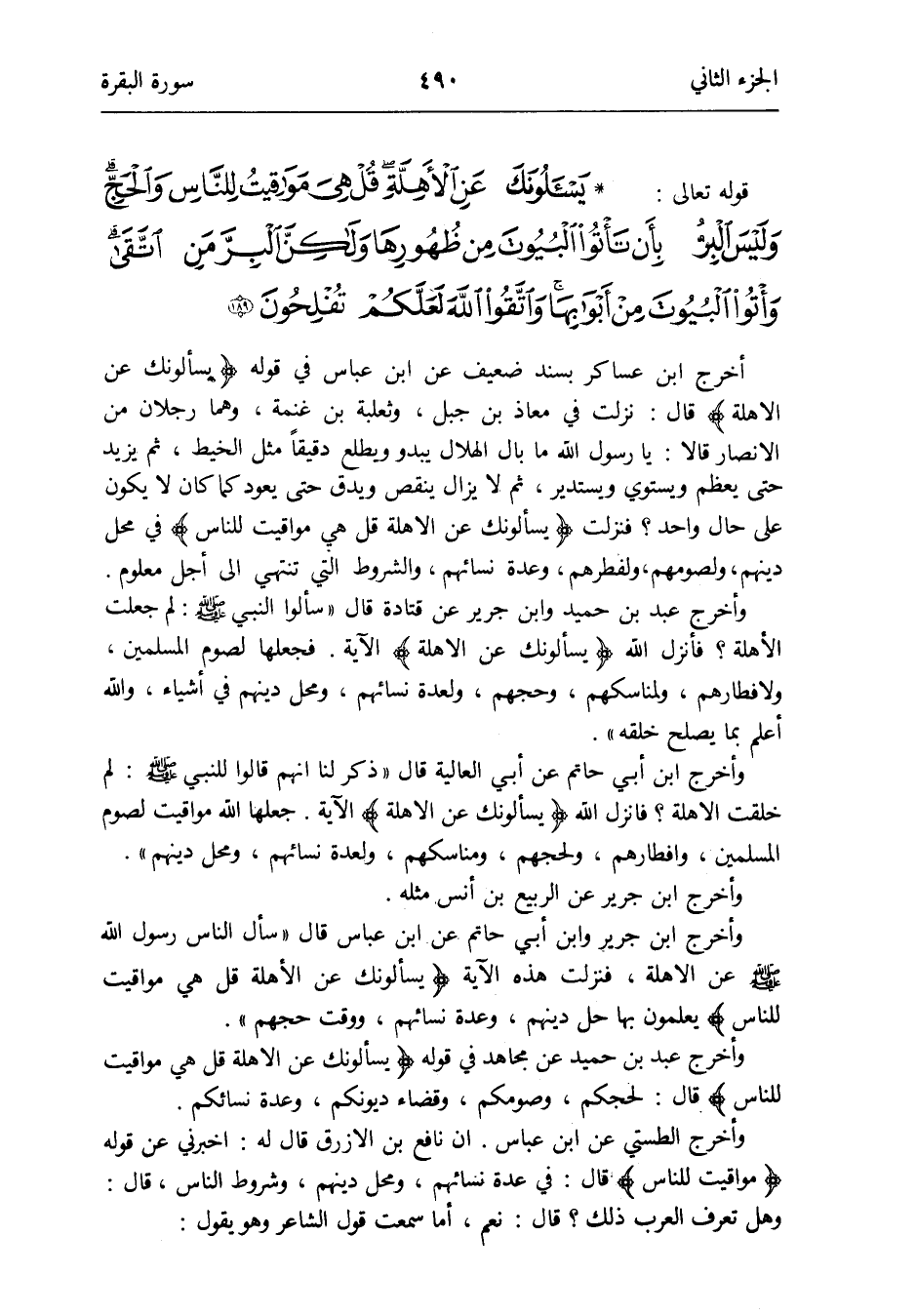 وَأخرج ابْن جرير وَابْن أبي حَاتِم عَن ابْن عَبَّاس قَالَ سَأَلَ النَّاس رَسُول الله صلى الله عَلَيْهِ وَسلم عَن الْأَهِلّة فَنزلت هَذِه الْآيَة {يَسْأَلُونَك عَن الْأَهِلّة قل هِيَ مَوَاقِيت للنَّاس} يعلمُونَ بهَا حل دينهم وعدة نِسَائِهِم وَوقت حجهم