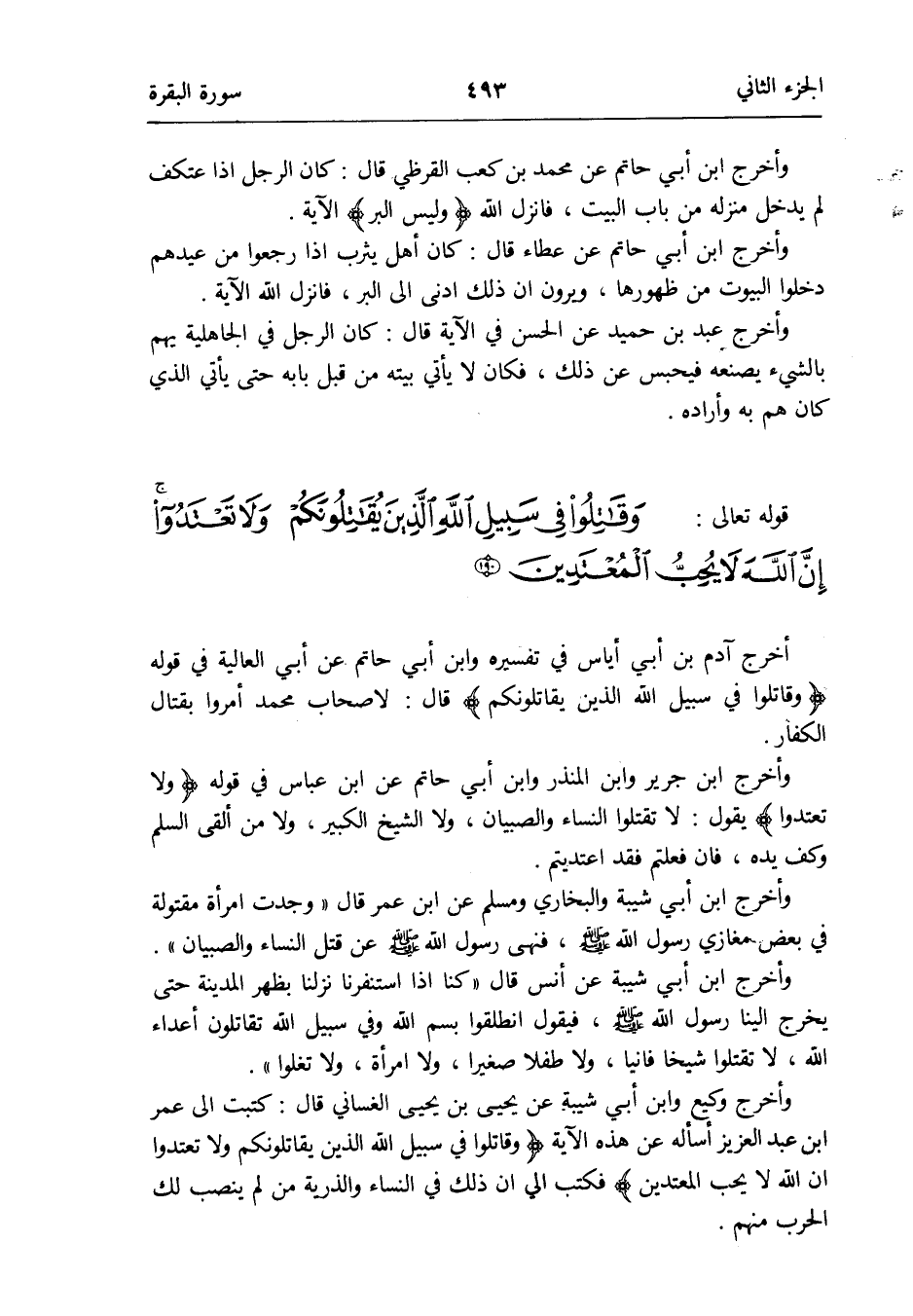 وَأخرج ابْن جرير وَابْن الْمُنْذر وَابْن أبي حَاتِم عَن ابْن عَبَّاس فِي قَوْله {وَلَا تَعْتَدوا} يَقُول: لَا تقتلُوا النِّسَاء وَالصبيان وَلَا الشَّيْخ الْكَبِير وَلَا من ألْقى السّلم وكف يَده فَإِن فَعلْتُمْ فقد اعتديتم