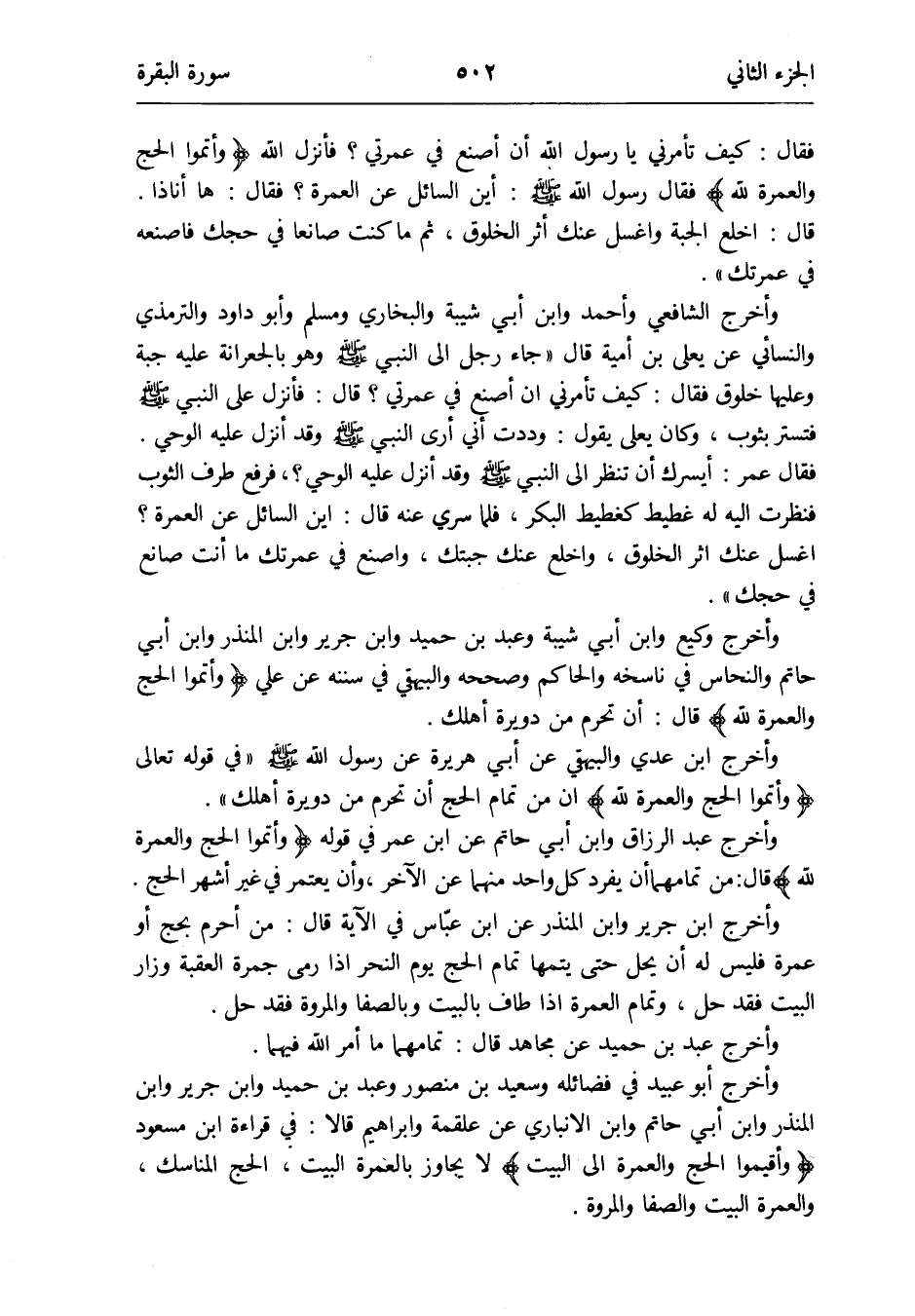 وَأخرج ابْن جرير وَابْن الْمُنْذر عَن ابْن عَبَّاس فِي الْآيَة قَالَ: من أحرم بِحَجّ أَو عمْرَة فَلَيْسَ لَهُ أَن يحل حَتَّى يُتمهَا تَمام الْحَج يَوْم النَّحْر إِذا رمى يَوْم النَّحْر إِذا رمى جَمْرَة الْعقبَة وزار الْبَيْت فقد حل وَتَمام الْعمرَة إِذا طَاف بِالْبَيْتِ وبالصفا والمروة إِذا حل