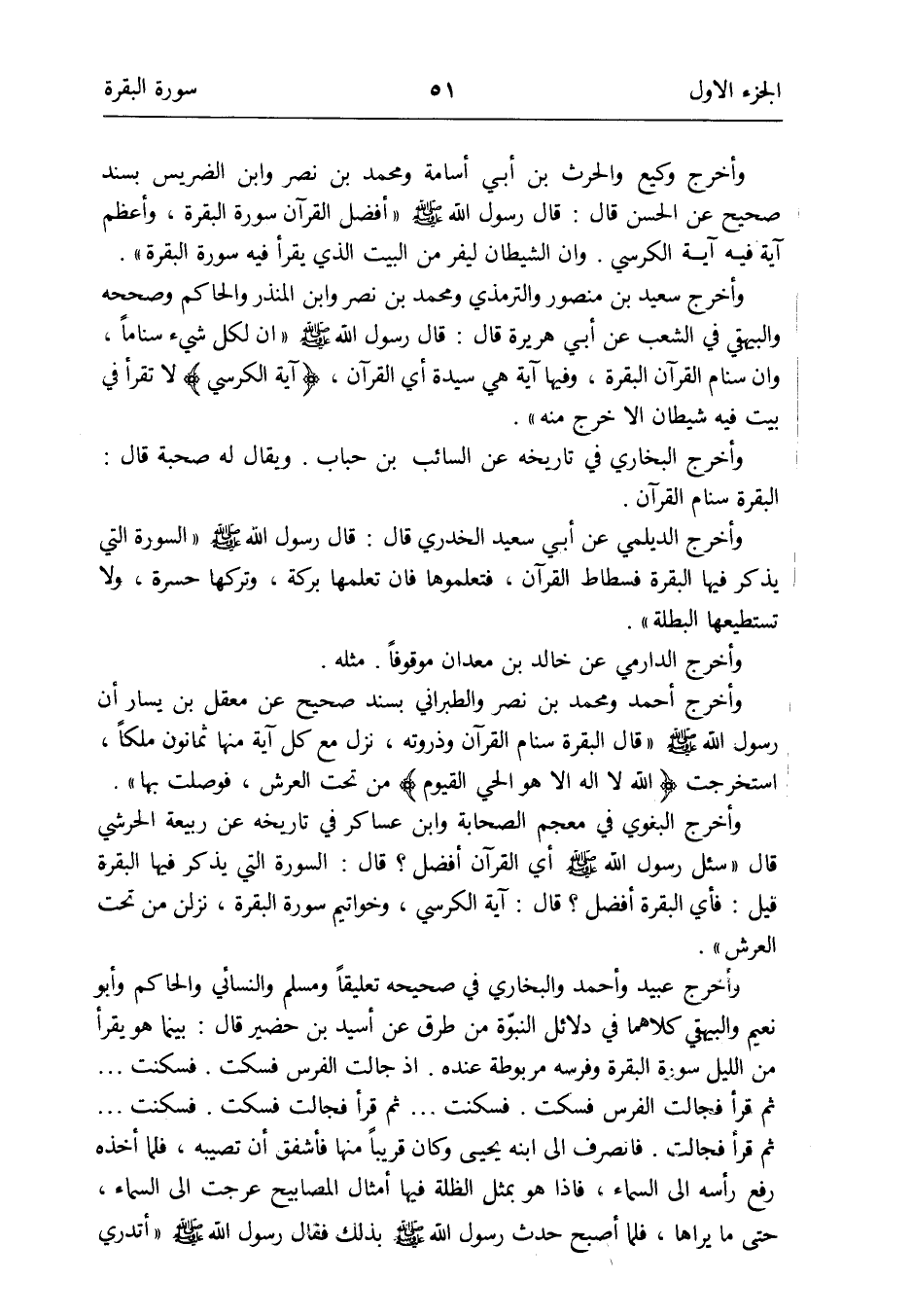 وَأخرج سعيد بن مَنْصُور وَالتِّرْمِذِيّ وَمُحَمّد بن نصر وَابْن الْمُنْذر وَالْحَاكِم وَصَححهُ وَالْبَيْهَقِيّ فِي الشّعب عَن أبي هُرَيْرَة قَالَ: قَالَ رَسُول الله صلى الله عَلَيْهِ وَسلم إِن لكل شَيْء سناما وَإِن سَنَام الْقُرْآن الْبَقَرَة وفيهَا آيَة هِيَ سيدة آي الْقُرْآن آيَة الْكُرْسِيّ لَا تقْرَأ فِي بَيت فِيهِ شَيْطَان إِلَّا خرج مِنْهُ