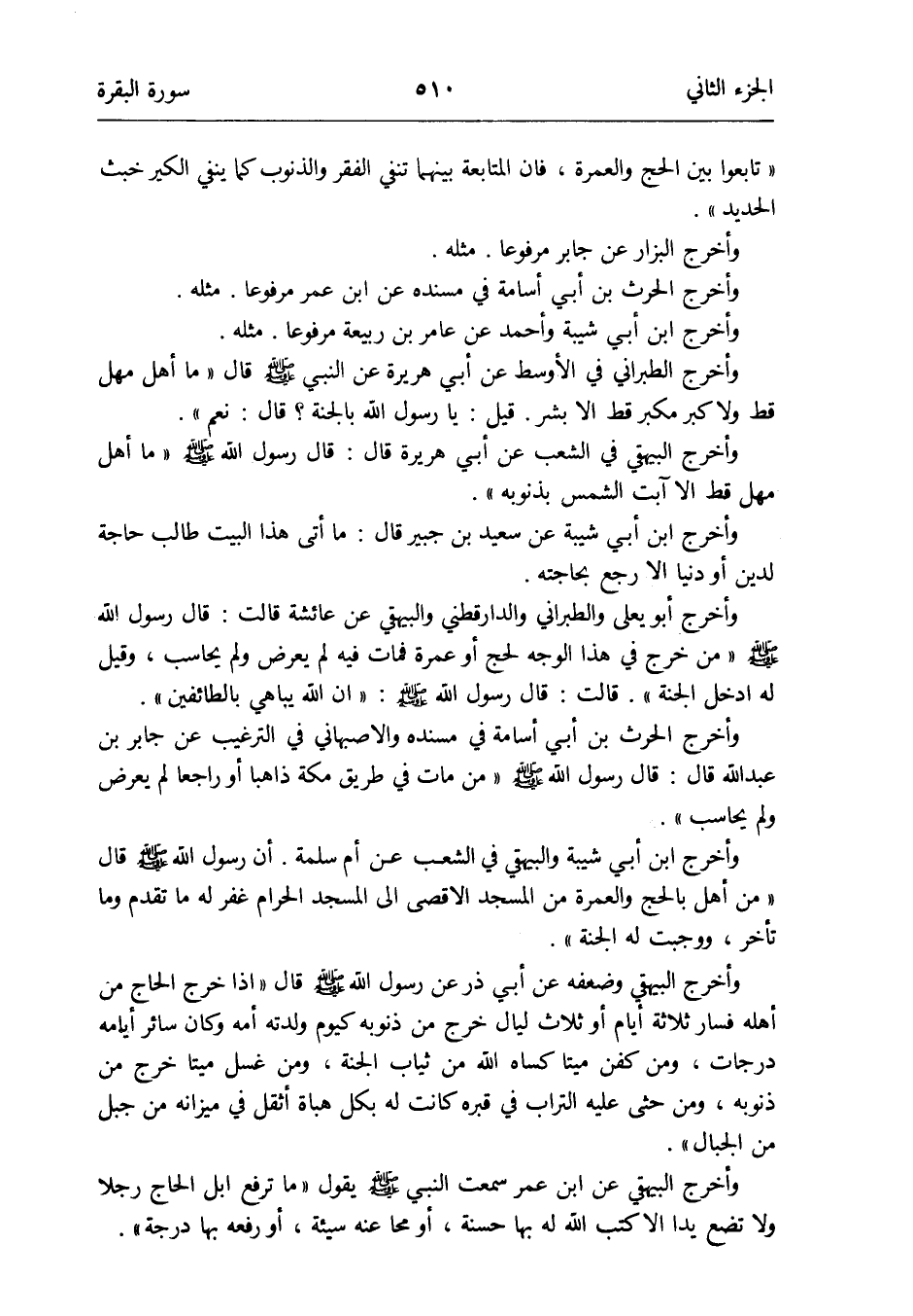 وَأخرج ابْن أبي شيبَة وَابْن ماجة وَابْن جرير وَالْبَيْهَقِيّ عَن عمر عَن النَّبِي صلى الله عَلَيْهِ وَسلم قَالَ تابعوا بَين الْحَج وَالْعمْرَة فَإِن الْمُتَابَعَة بَينهمَا تَنْفِي الْفقر والذنُوب كَمَا يَنْفِي الْكِير خبث الْحَدِيد