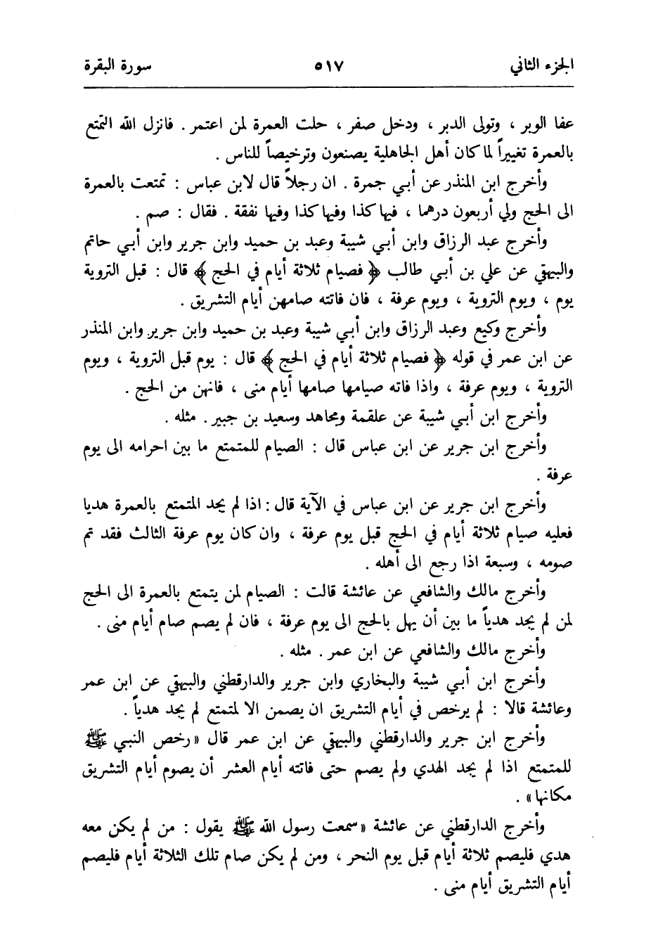 وَأخرج ابْن جرير وَالدَّارَقُطْنِيّ وَالْبَيْهَقِيّ عَن ابْن عمر قَالَ رخص النَّبِي صلى الله عَلَيْهِ وَسلم للمتمتع إِذا لم يجد الْهَدْي وَلم يصم حَتَّى فَاتَتْهُ أَيَّام الْعشْر أَن يَصُوم أَيَّام التَّشْرِيق مَكَانهَا