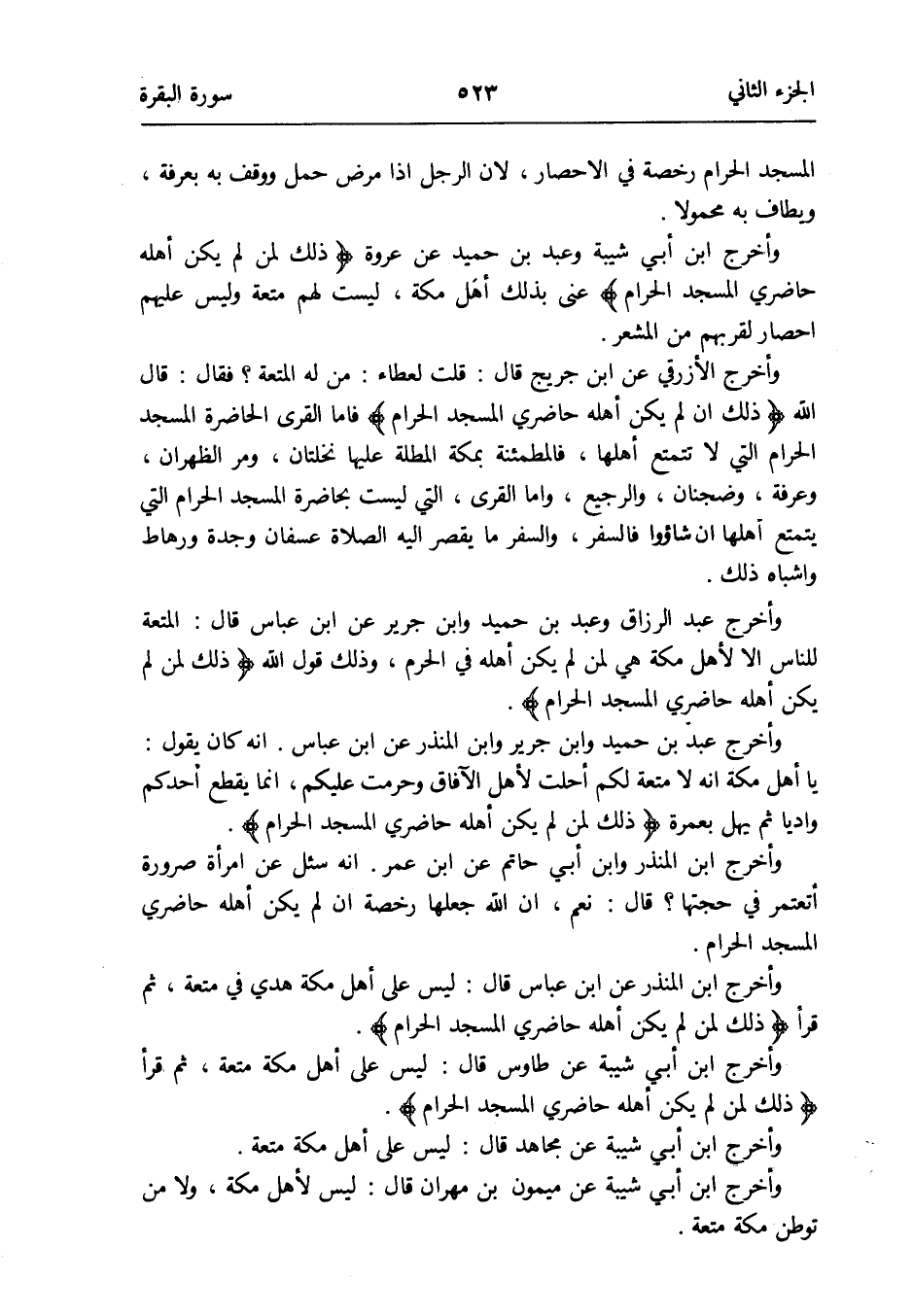 وَأخرج عبد الرَّزَّاق وَعبد بن حميد عَن ابْن عَبَّاس قَالَ: الْمُتْعَة للنَّاس إِلَّا لأهل مَكَّة هِيَ لمن لم يكن أَهله فِي الْحرم وَذَلِكَ قَول الله {ذَلِك لمن لم يكن أَهله حاضري الْمَسْجِد الْحَرَام}