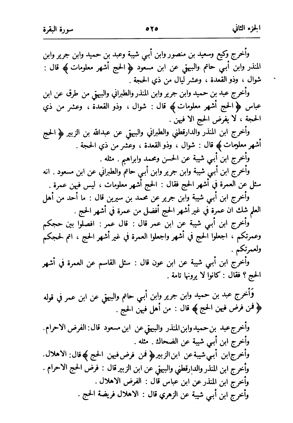 وَأخرج ابْن الْمُنْذر وَالدَّارَقُطْنِيّ وَالطَّبَرَانِيّ وَالْبَيْهَقِيّ عَن عبد الله بن الزبير {الْحَج أشهر مَعْلُومَات} قَالَ شَوَّال وَذُو القعده وَعشر من ذِي الْحجَّة