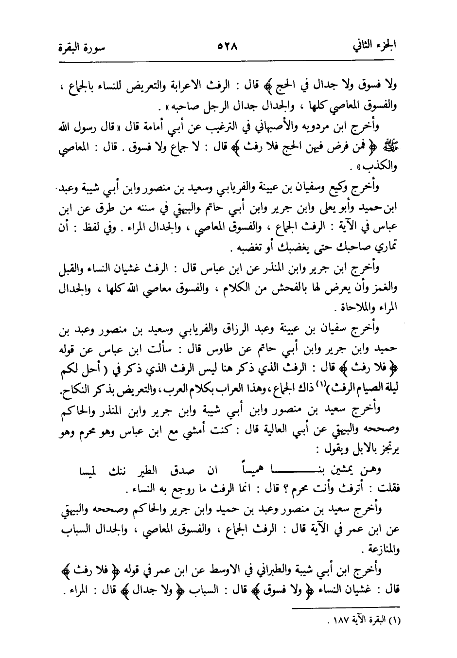 وَأخرج سُفْيَان بن عَيْنِيَّة وَعبد الرَّزَّاق وَالْفِرْيَابِي وَسَعِيد بن مَنْصُور وَعبد بن حميد وَابْن جرير وَابْن أبي حَاتِم عَن طَاوس قَالَ: سَأَلت ابْن عَبَّاس عَن قَوْله {فَلَا رفث} قَالَ: الرَّفَث الَّذِي ذكر هُنَا لَيْسَ الرَّفَث الَّذِي ذكر فِي (أحل لكم لَيْلَة الصّيام الرَّفَث) (الْبَقَرَة الْآيَة 187) ذَاك الْجِمَاع هَذَا العراب بِكَلَام الْعَرَب والتعريض بِذكر النِّكَاح
