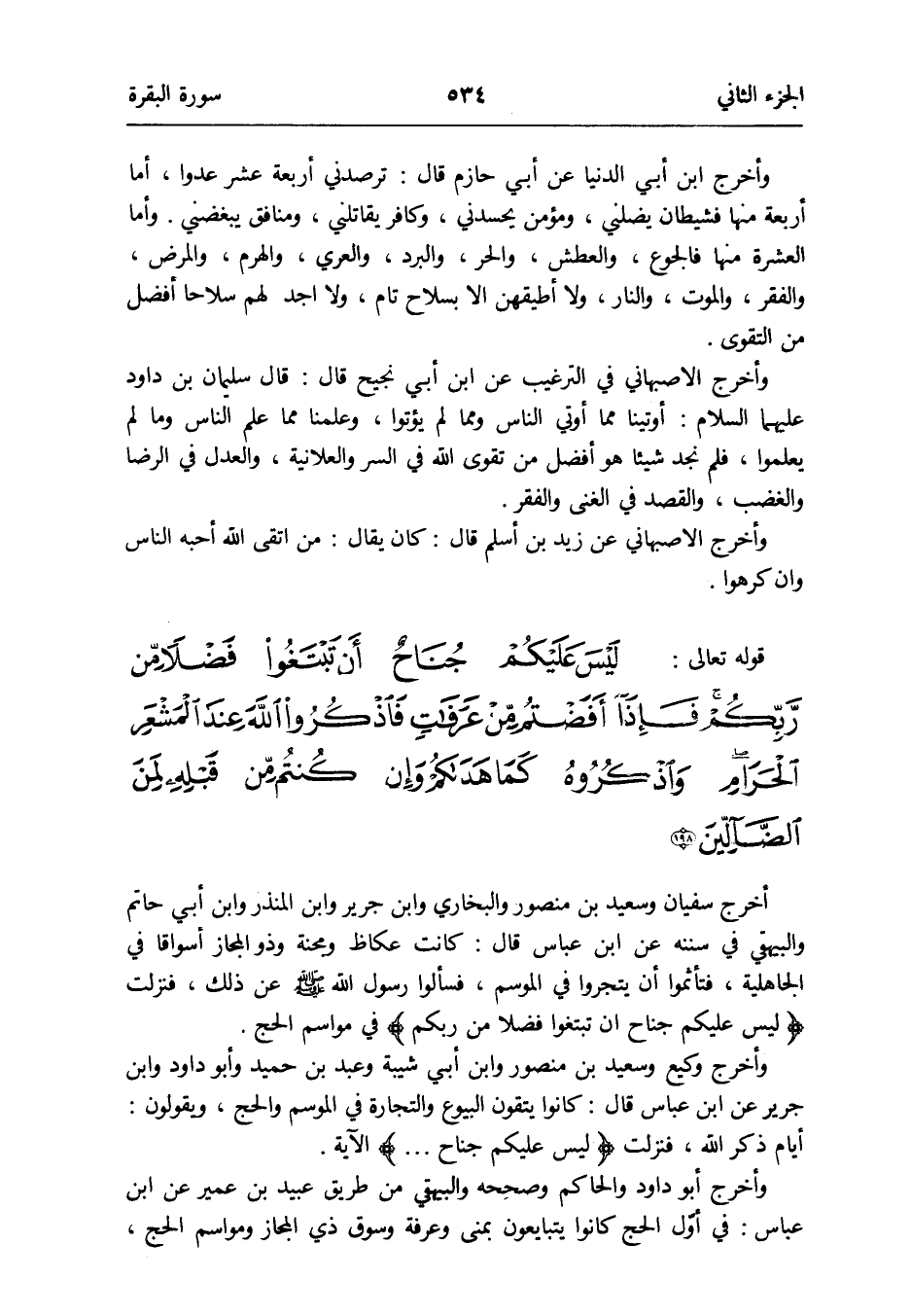 أخرج سُفْيَان وَسَعِيد بن مَنْصُور وَالْبُخَارِيّ وَابْن جرير وَابْن الْمُنْذر وَابْن أبي حَاتِم وَالْبَيْهَقِيّ فِي سنَنه عَن ابْن عَبَّاس قَالَ: كَانَت عكاظ ومجنة وَذُو الْمجَاز أسواقاً فِي الْجَاهِلِيَّة فتأثموا أَن يتجروا فِي الْمَوْسِم فسألوا رَسُول الله صلى الله عَلَيْهِ وَسلم عَن ذَلِك فَنزلت {لَيْسَ عَلَيْكُم جنَاح أَن تَبْتَغُوا فضلا من ربكُم} فِي مواسم الْحَج