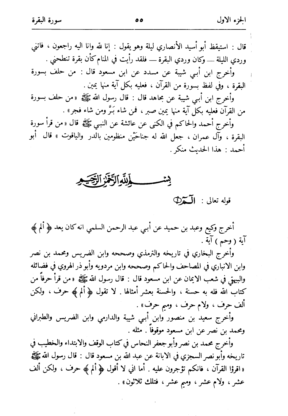 وَأخرج البُخَارِيّ فِي تَارِيخه وَالتِّرْمِذِيّ وَصَححهُ وَابْن الضريس وَمُحَمّد بن نصر وَابْن الْأَنْبَارِي فِي الْمَصَاحِف وَالْحَاكِم وَصَححهُ وَابْن مرْدَوَيْه وَأَبُو ذَر الْهَرَوِيّ فِي فضائله وَالْبَيْهَقِيّ فِي شعب الإِيمان عَن ابْن مَسْعُود قَالَ: قَالَ رَسُول الله صلى الله عَلَيْهِ وَسلم من قَرَأَ حرفا من كتاب الله فَلهُ بِهِ حَسَنَة والحسنة بِعشْرَة أَمْثَالهَا