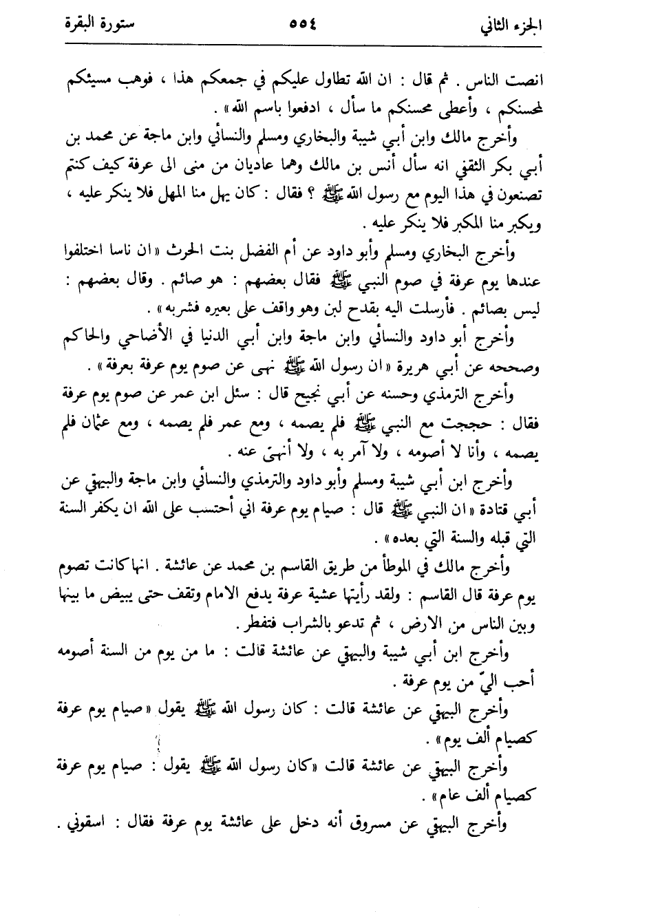 وَأخرج ابْن أبي شيبَة وَمُسلم وَأَبُو دَاوُد وَالتِّرْمِذِيّ وَالنَّسَائِيّ وَابْن ماجة وَالْبَيْهَقِيّ عَن أبي قَتَادَة أَن النَّبِي صلى الله عَلَيْهِ وَسلم قَالَ: صِيَام يَوْم عَرَفَة إِنِّي أحتسب على الله أَن يكفر السّنة الَّتِي قبله وَالسّنة الَّتِي بعده