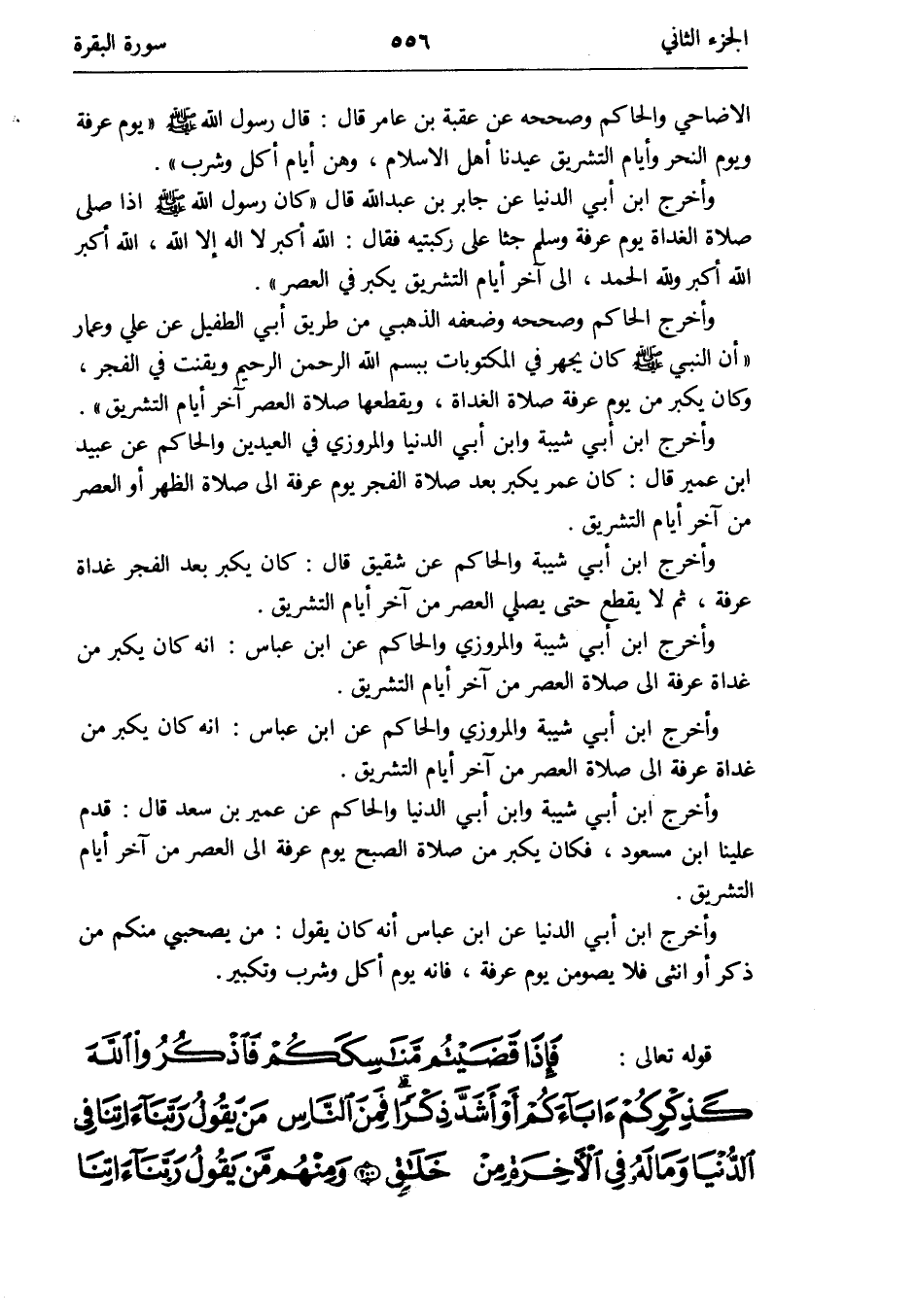 وَأخرج ابْن أبي شيبَة والمروزي وَالْحَاكِم عَن ابْن عَبَّاس: أَنه كَانَ يكبر من غَدَاة عَرَفَة إِلَى صَلَاة الْعَصْر من آخر أَيَّام التَّشْرِيق