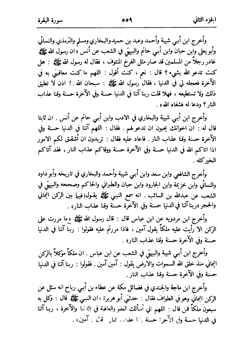 وَأخرج ابْن مرْدَوَيْه عَن ابْن عَبَّاس قَالَ: قَالَ رَسُول الله صلى الله عَلَيْهِ وَسلم مَا مَرَرْت على الرُّكْن إِلَّا رَأَيْت عَلَيْهِ ملكا يَقُول آمين فَإِذا مررتم عَلَيْهِ فَقولُوا: رَبنَا آتنا فِي الدُّنْيَا حَسَنَة وَفِي الْآخِرَة حَسَنَة وقنا عَذَاب النَّار