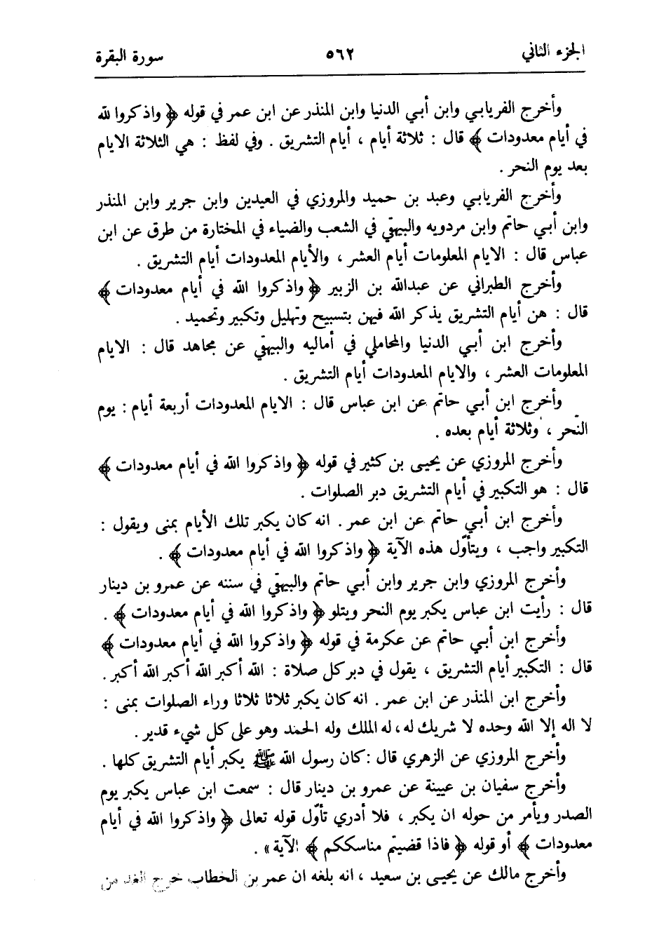 وَأخرج سُفْيَان بن عَيْنِيَّة عَن عَمْرو بن دِينَار قَالَ: سَمِعت ابْن عَبَّاس يكبر يَوْم الصَّدْر وَيَأْمُر من حوله أَن يكبر فَلَا أَدْرِي تأوّل قَوْله تَعَالَى {واذْكُرُوا الله فِي أَيَّام معدودات} أَو قَوْله {فَإِذا قضيتم مَنَاسِككُم} الْآيَة