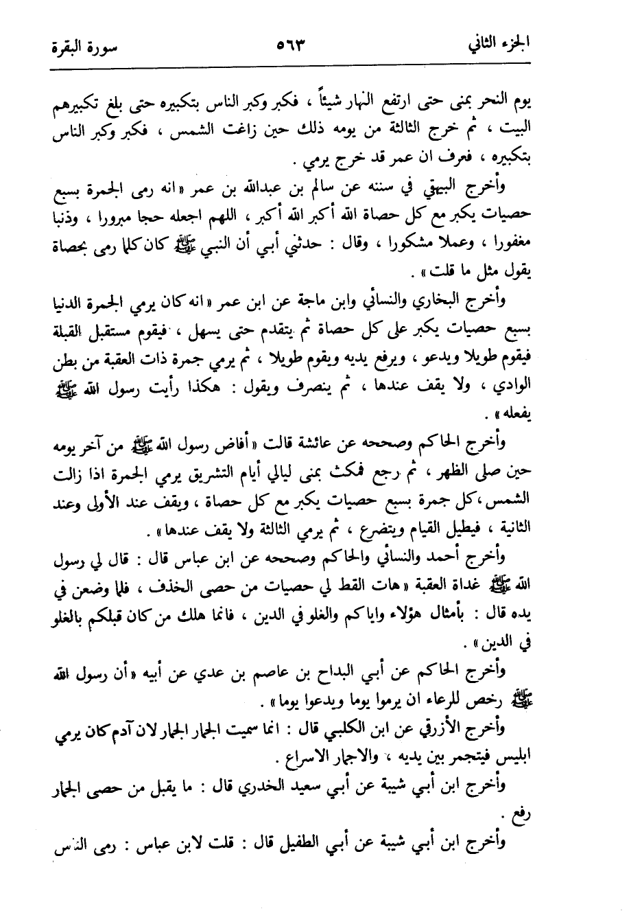 وَأخرج البُخَارِيّ وَالنَّسَائِيّ وَابْن ماجة عَن ابْن عمر أَنه كَانَ يَرْمِي الْجَمْرَة الدُّنْيَا بِسبع حَصَيَات يكبر على كل حَصَاة ثمَّ يتَقَدَّم حَتَّى يسهل فَيقوم مُسْتَقْبل الْقبْلَة فَيقوم طَويلا وَيَدْعُو وَيرْفَع يَدَيْهِ يقوم طَويلا ثمَّ يَرْمِي جَمْرَة ذَات الْعقبَة من بطن الْوَادي وَلَا يقف عِنْدهَا ثمَّ ينْصَرف وَيَقُول: هَكَذَا رَأَيْت رَسُول الله صلى الله عَلَيْهِ وَسلم يَفْعَله