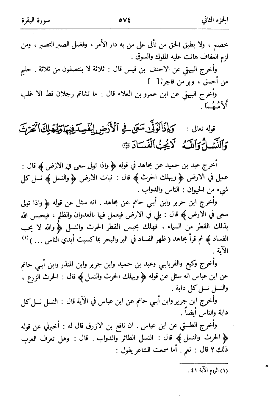 وَأخرج وَكِيع وَالْفِرْيَابِي وَعبد بن حميد وَابْن جرير وَابْن الْمُنْذر وَابْن أبي حَاتِم عَن ابْن عَبَّاس أَنه سُئِلَ عَن قَوْله {وَيهْلك الْحَرْث والنسل} قَالَ: الْحَرْث الزَّرْع والنسل نسل كل دَابَّة