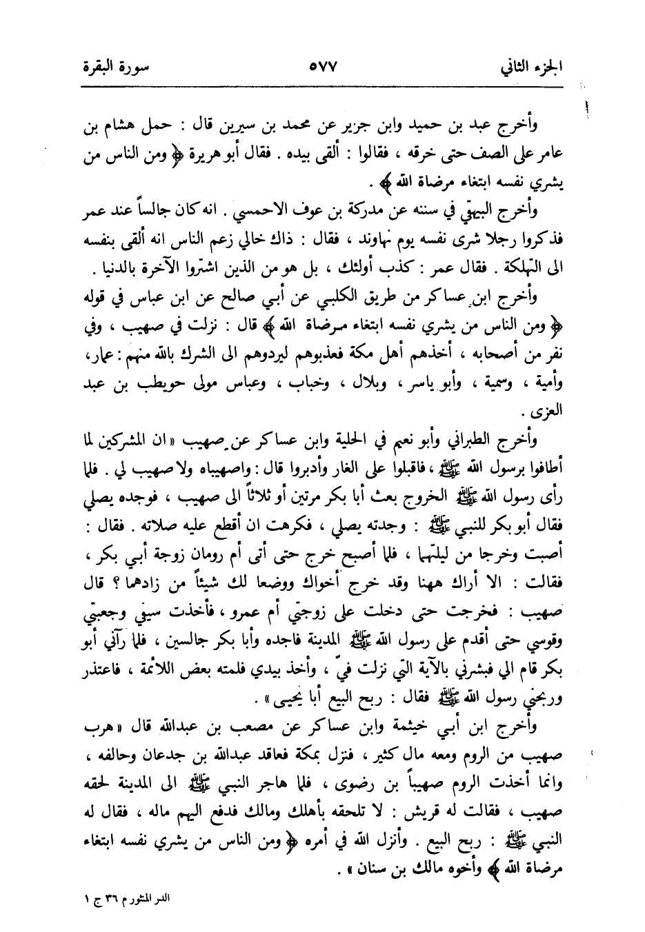 وَأخرج ابْن عَسَاكِر من طَرِيق الْكَلْبِيّ عَن أبي صَالح عَن ابْن عَبَّاس فِي قَوْله {وَمن النَّاس من يشري نَفسه ابْتِغَاء مرضات الله} قَالَ: نزلت فِي صُهَيْب وَفِي نفر من أَصْحَابه أَخذهم أهل مَكَّة فعذبوهم ليردوهم إِلَى الشّرك بِاللَّه مِنْهُم عمار وَأُميَّة وَسُميَّة وَأَبُو يَاسر وبلال وخباب وعباس مولى حويطب بن عبد الْعُزَّى