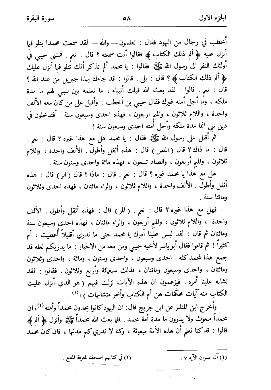 قَالُوا: لقد بعث الله قبلك أَنْبيَاء مانعلمه بَين لنَبِيّ لَهُم مَا مُدَّة ملكه وَمَا أجل أمته غَيْرك فَقَالَ حييّ بن أَخطب: وَأَقْبل على من مَعَه الْألف وَاحِدَة وَاللَّام ثَلَاثُونَ وَالْمِيم أَرْبَعُونَ فَهَذِهِ احدى وَسَبْعُونَ سنة