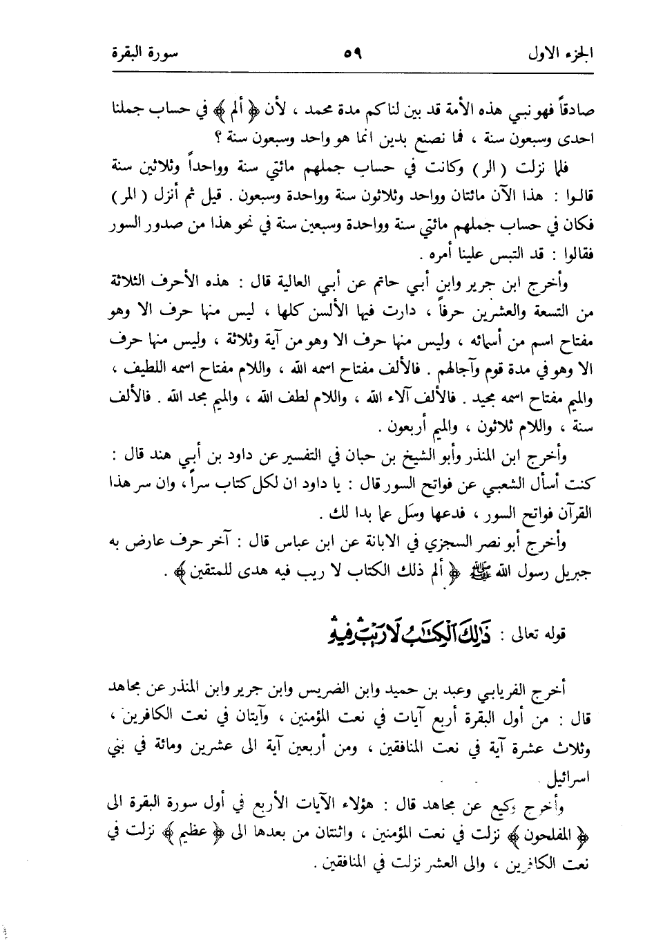 قيل ثمَّ أنزل (المر) فَكَانَ فِي حِسَاب حملهمْ مِائَتي سنة وَوَاحِدَة وَسبعين سنة فِي نَحْو هَذَا من صُدُور السُّور فَقَالُوا: قد الْتبس علينا أمره