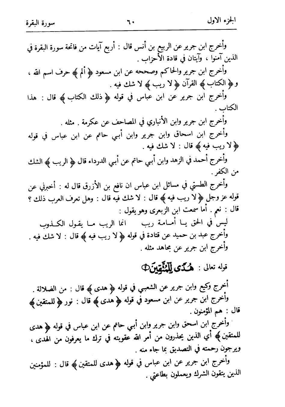 وَأخرج ابْن جرير عَن ابْن مَسْعُود فِي قَوْله {هدى} قَالَ: نور {لِلْمُتقين} قَالَ: هم الْمُؤْمِنُونَ