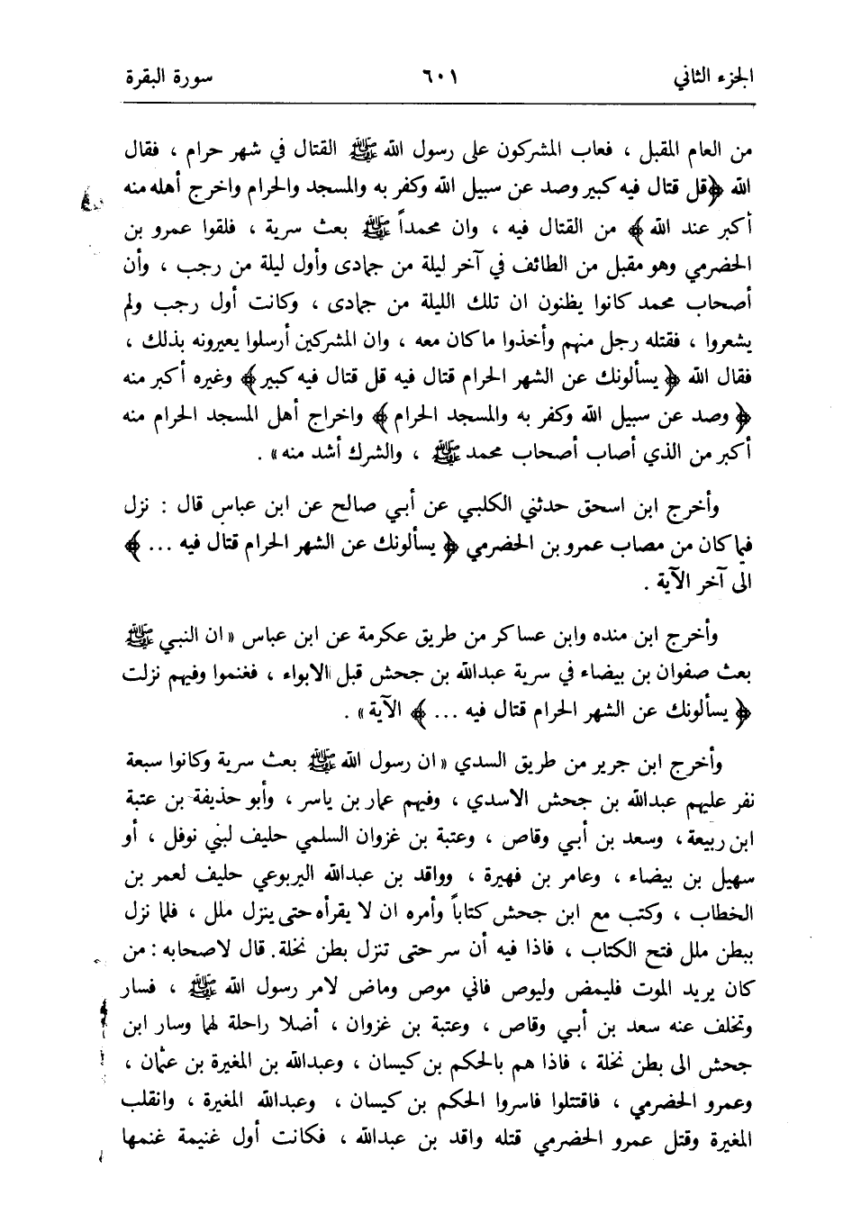 وَأخرج ابْن إِسْحَق حَدثنِي الْكَلْبِيّ عَن أبي صَالح عَن ابْن عَبَّاس قَالَ: نزل فِيمَا كَانَ من مصاب عَمْرو بن الْحَضْرَمِيّ {يَسْأَلُونَك عَن الشَّهْر الْحَرَام قتال فِيهِ} إِلَى آخر الْآيَة