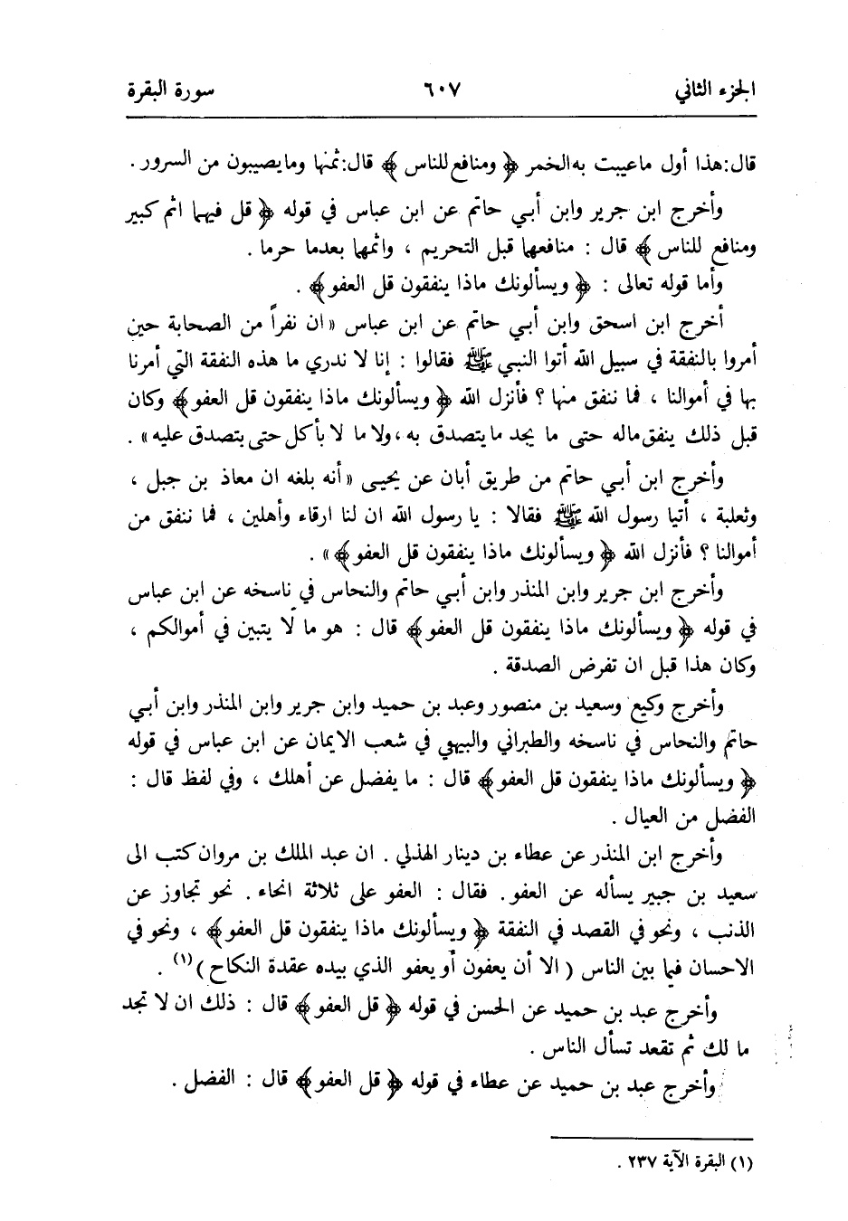 وَأخرج ابْن جرير وَابْن الْمُنْذر وَابْن أبي حَاتِم والنحاس فِي ناسخه عَن ابْن عَبَّاس فِي قَوْله {ويسألونك مَاذَا يُنْفقُونَ قل الْعَفو} قَالَ: هُوَ مَا لَا يتَبَيَّن فِي أَمْوَالكُم وَكَانَ هَذَا قبل أَن تفرض الصَّدَقَة