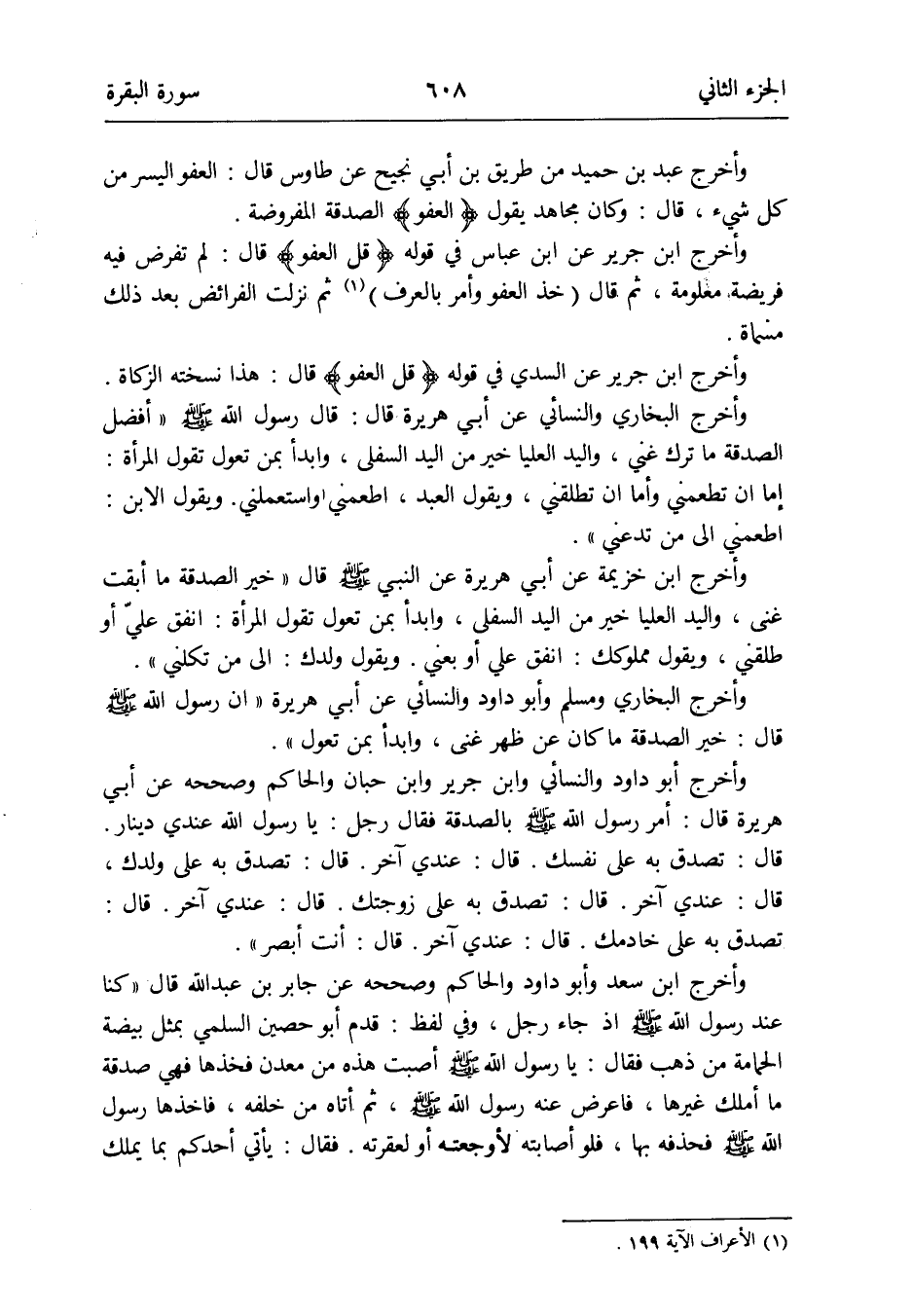 وَأخرج ابْن جرير عَن ابْن عَبَّاس فِي قَوْله {قل الْعَفو} قَالَ: لم تفرض فِيهِ فَرِيضَة مَعْلُومَة ثمَّ قَالَ (خُذ الْعَفو وَأمر بِالْعرْفِ) (الْأَعْرَاف الْآيَة 199) ثمَّ نزلت الْفَرَائِض بعد ذَلِك مُسَمَّاة