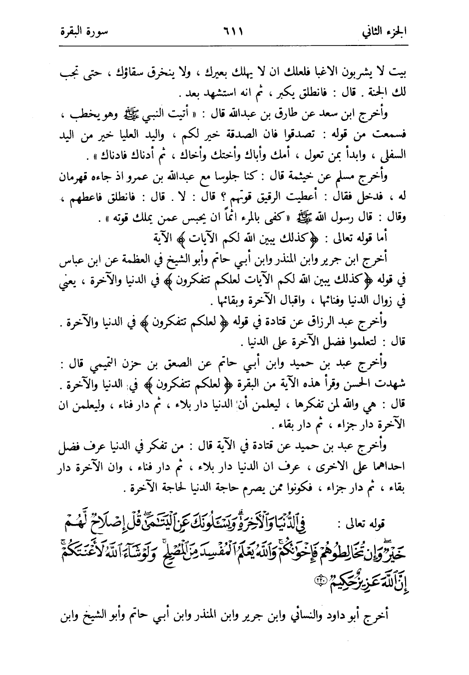 أما قَوْله تَعَالَى: {كَذَلِك يبين الله لكم الْآيَات} الْآيَة أخرج ابْن جرير وَابْن الْمُنْذر وَابْن أبي حَاتِم وَأَبُو الشَّيْخ فِي العظمة عَن ابْن عَبَّاس فِي قَوْله {كَذَلِك يبين الله لكم الْآيَات لَعَلَّكُمْ تتفكرون} فِي الدُّنْيَا وَالْآخِرَة يَعْنِي فِي زَوَال الدُّنْيَا وفنائها واقبال الْآخِرَة وبقائها