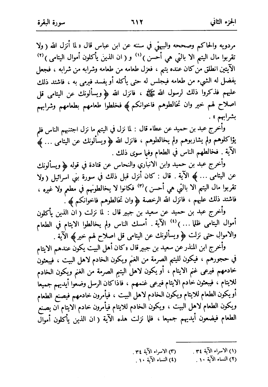 مرْدَوَيْه وَالْحَاكِم وَصَححهُ وَالْبَيْهَقِيّ فِي سنَنه عَن ابْن عَبَّاس قَالَ لما أنزل الله (وَلَا تقربُوا مَال الْيَتِيم إِلَّا بِالَّتِي هِيَ أحسن) (الْإِسْرَاء الْآيَة 34) و (إِن الَّذين يَأْكُلُون أَمْوَال الْيَتَامَى) (النِّسَاء الْآيَة 10) الْآيَتَيْنِ انْطلق من كَانَ عِنْده يَتِيم فعزل طَعَامه من طَعَامه وَشَرَابه من شرابه فَجعل يفضل لَهُ الشَّيْء من طَعَامه فيجلس لَهُ حَتَّى يَأْكُلهُ أَو يفْسد فَيَرْمِي بِهِ فَاشْتَدَّ عَلَيْهِم فَذكرُوا ذَلِك لرَسُول الله صلى الله عَلَيْهِ وَسلم فَأنْزل الله {ويسألونك عَن الْيَتَامَى قل إصْلَاح لَهُم خير وَإِن تخالطوهم فإخوانكم} فخلطوا طعامهم بطعامهم وشرابهم بشرابهم