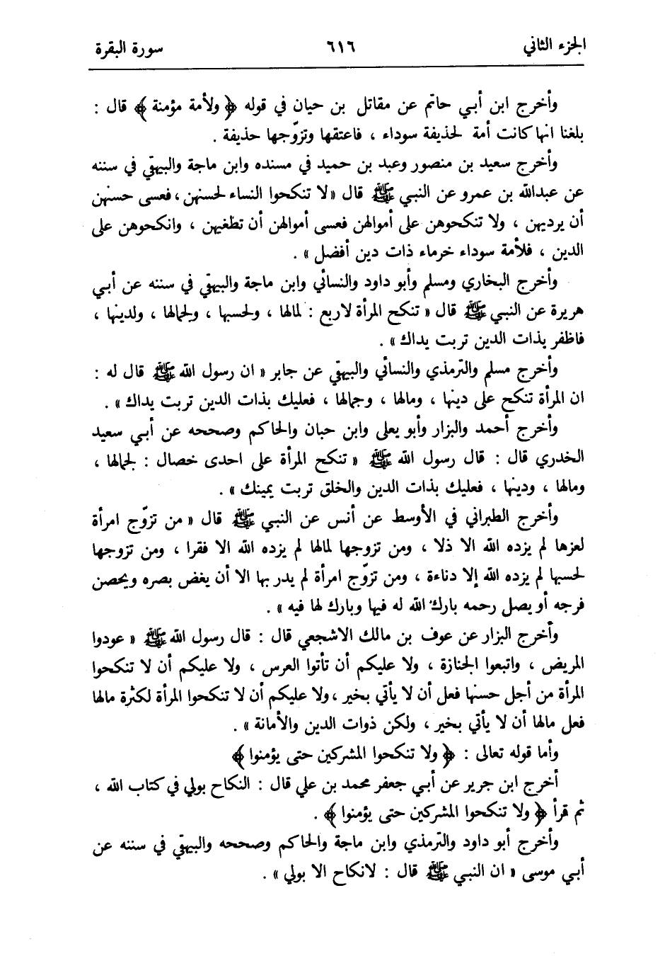 وَأما قَوْله تَعَالَى: {وَلَا تنْكِحُوا الْمُشْركين حَتَّى يُؤمنُوا} أخرج ابْن جرير عَن أبي جَعْفَر مُحَمَّد بن عَليّ قَالَ: النِّكَاح بوليّ فِي كتاب الله ثمَّ قَرَأَ {وَلَا تنْكِحُوا الْمُشْركين حَتَّى يُؤمنُوا}