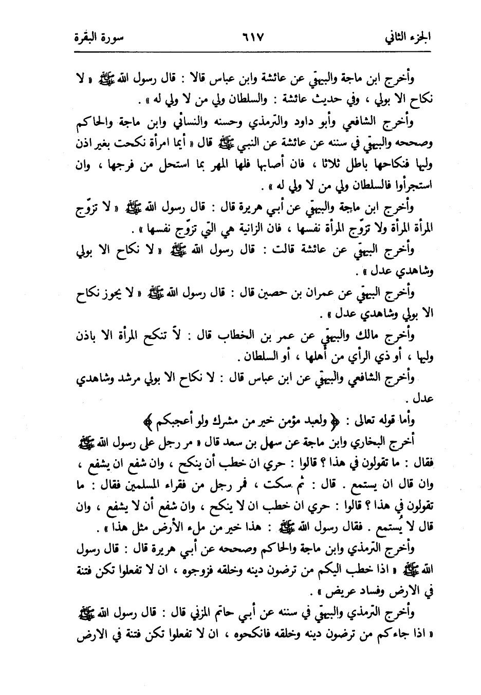 وَأخرج الشَّافِعِي وَأَبُو دَاوُد وَالتِّرْمِذِيّ وَحسنه وَالنَّسَائِيّ وَابْن ماجة وَالْحَاكِم وَصَححهُ وَالْبَيْهَقِيّ فِي سنَنه عَن عَائِشَة عَن النَّبِي صلى الله عَلَيْهِ وَسلم قَالَ أَيّمَا امْرَأَة نكحت بِغَيْر إِذن وَليهَا فنكاحها بَاطِل ثَلَاثًا فَإِن أَصَابَهَا فلهَا الْمهْر بِمَا اسْتحلَّ من فرجهَا وَإِن استجرأوا فالسلطان ولي من لَا ولي لَهُ
