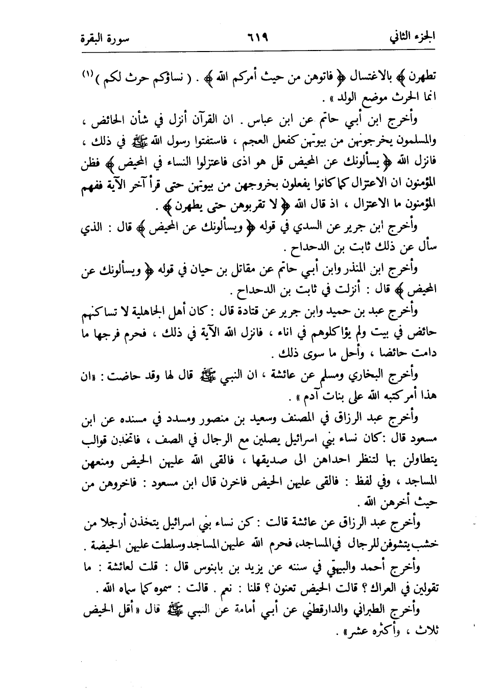 وَأخرج عبد بن حميد وَابْن جرير عَن قَتَادَة قَالَ: كَانَ أهل الْجَاهِلِيَّة لَا تساكنهم حَائِض فِي بَيت وَلم يؤاكلوهم فِي إِنَاء فَأنْزل الله الْآيَة فِي ذَلِك فَحرم فرجهَا مَا دَامَت حَائِضًا وَأحل مَا سوى ذَلِك
