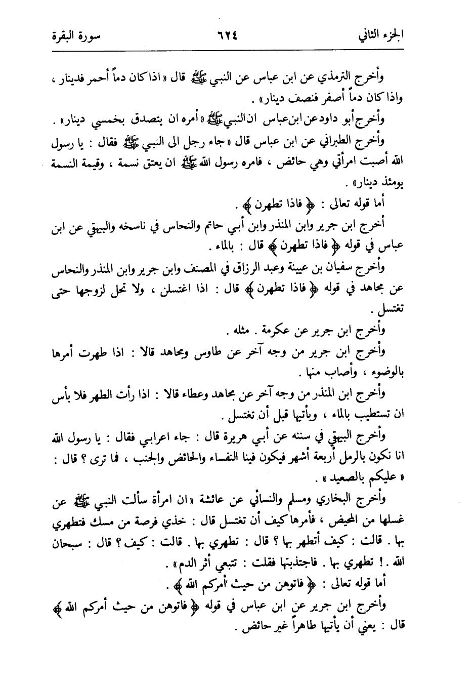 أخرج ابْن جرير وَابْن الْمُنْذر وَابْن أبي حَاتِم والنحاس فِي ناسخه وَالْبَيْهَقِيّ عَن ابْن عَبَّاس فِي قَوْله {فَإِذا تطهرن} قَالَ: بِالْمَاءِ