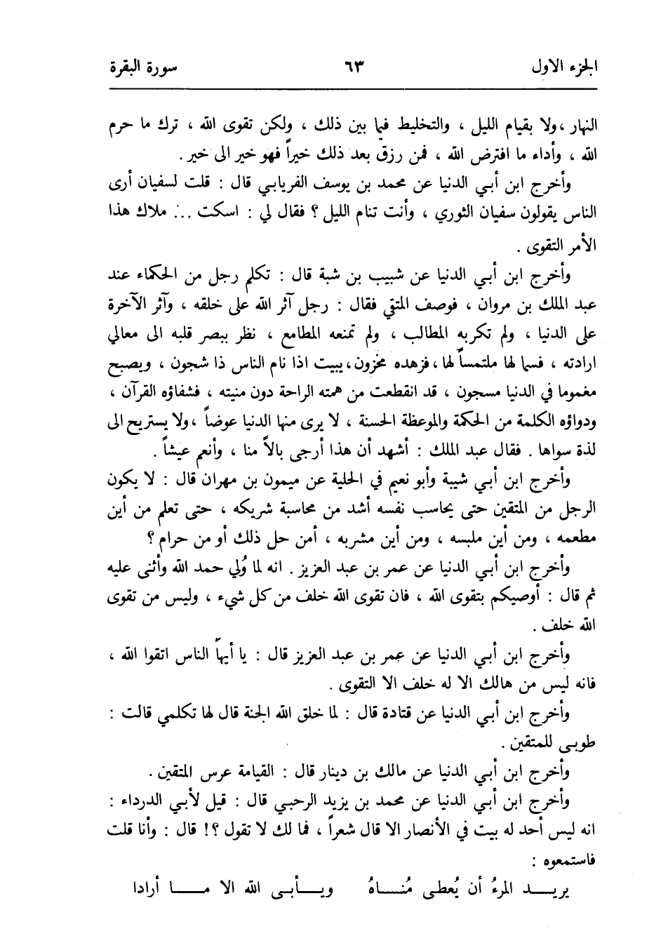 وَأخرج ابْن أبي الدُّنْيَا عَن شبيب بن شبة قَالَ: تكلم رجل من الْحُكَمَاء عِنْد عبد الْملك بن مَرْوَان فوصف المتقي فَقَالَ: رجل آثر الله على خلقه وآثر الْآخِرَة على الدُّنْيَا وَلم تكربه المطالب وَلم تَمنعهُ المطامع نظر ببصر قلبه إِلَى معالي إِرَادَته فسما لَهَا ملتمساً لَهَا فزهده مخزون يبيت إِذا نَام النَّاس ذَا شجون وَيُصْبِح مغموماً فِي الدُّنْيَا مسجون قد انْقَطَعت من همته الرَّاحَة دون منيته فشفاؤه الْقُرْآن ودواؤه الْكَلِمَة من الْحِكْمَة وَالْمَوْعِظَة الْحَسَنَة لَا يرى مِنْهَا الدُّنْيَا عوضا وَلَا يستريح إِلَى لَذَّة سواهَا